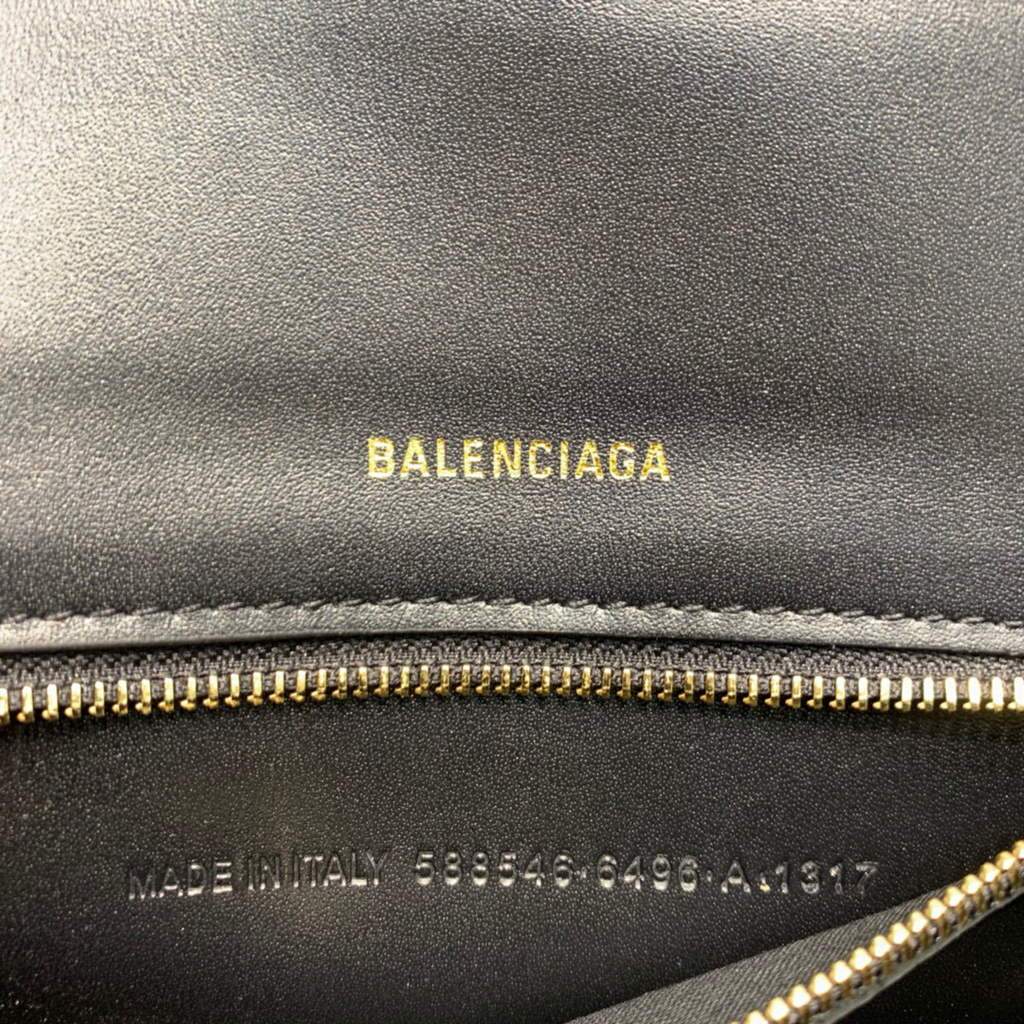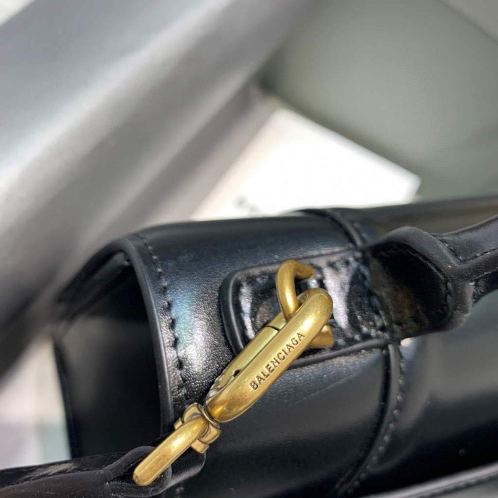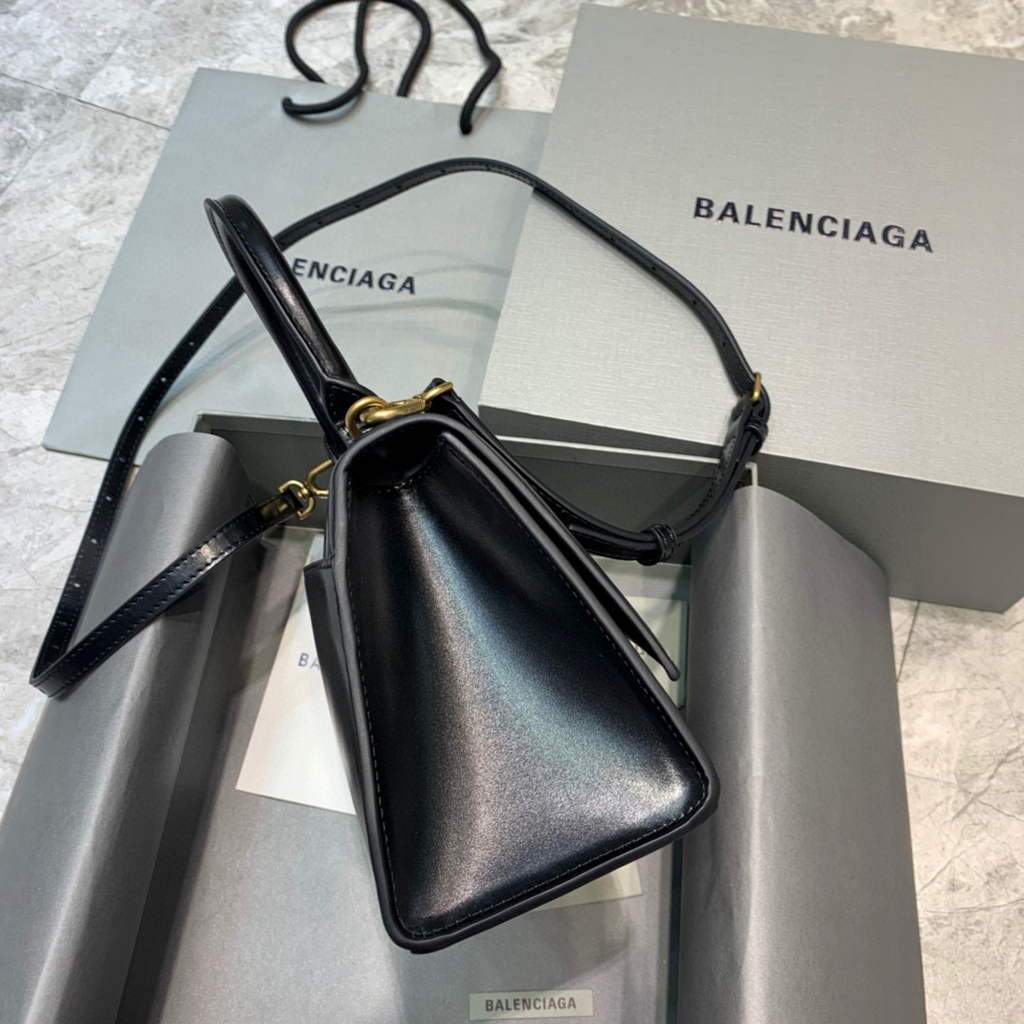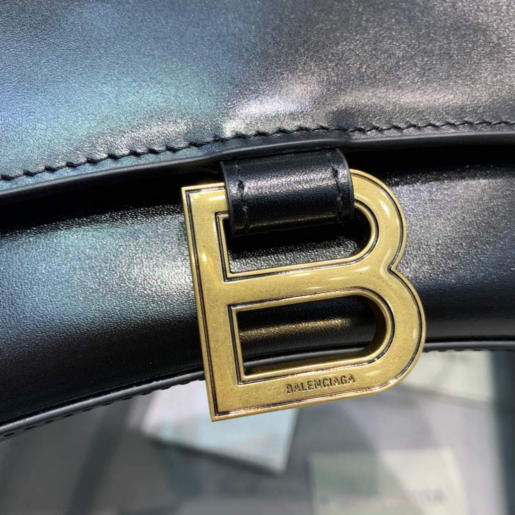 Bolsa Balenciaga Hourglass pequena na cor preta com detalhes dourados é uma peça elegante e atemporal. Confeccionada em couro de bezerro brilhante, apresenta um formato de ampulheta único, uma aba longa, uma alça ajustável e removível e um fecho magnético com o icônico logotipo B. O interior forrado em couro de cordeiro macio oferece espaço para itens essenciais, enquanto o bolso traseiro e o bolso interno mantêm os objetos organizados.