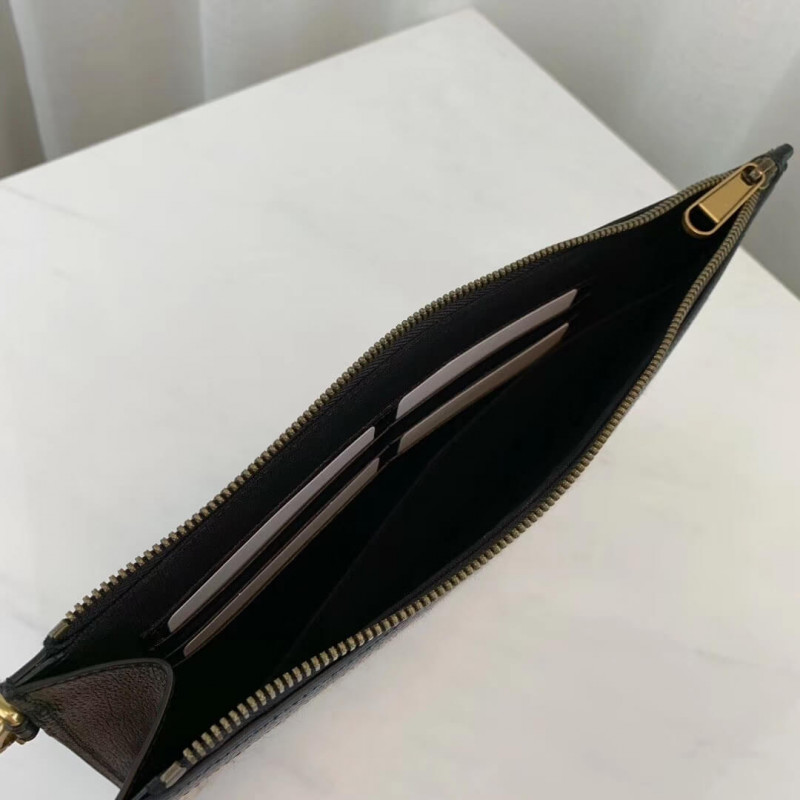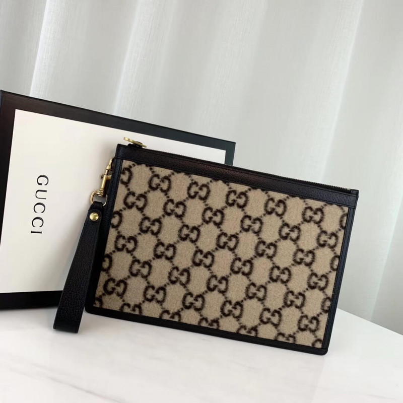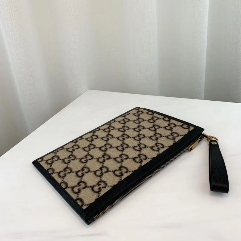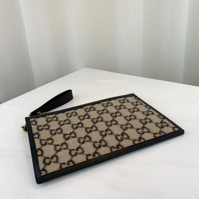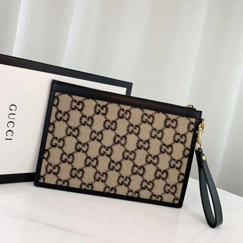 A bolsa com zíper é apresentada na interpretação contemporânea Beige e Ebony GG Woolsa do design original dos anos 30, o tecido distinto é exibido durante todo o Cruise 2020 pronto para vestir e acessórios. Aparado com couro preto texturizado, o design vem com uma alça removível que prende ao redor do pulso.