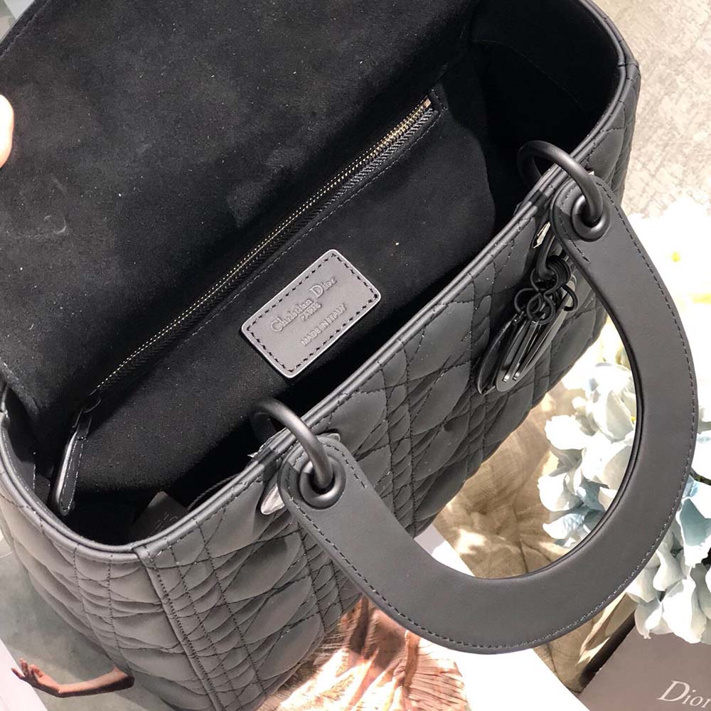 A bolsa Lady Dior simboliza a visão de elegância e beleza de Dior. Uma bolsa elegante e feminina, é atemporal, mas moderna. Criado com pele de bezerro de pedra cinza fosca para um acabamento elegante, seu supremo acolchoado se destaca instantaneamente. A assinatura tonal ‘D.?i.?o.?r.’ Charmos embelezam sua silhueta. Este estilo médio tem uma alça de ombro de couro fina e removível.