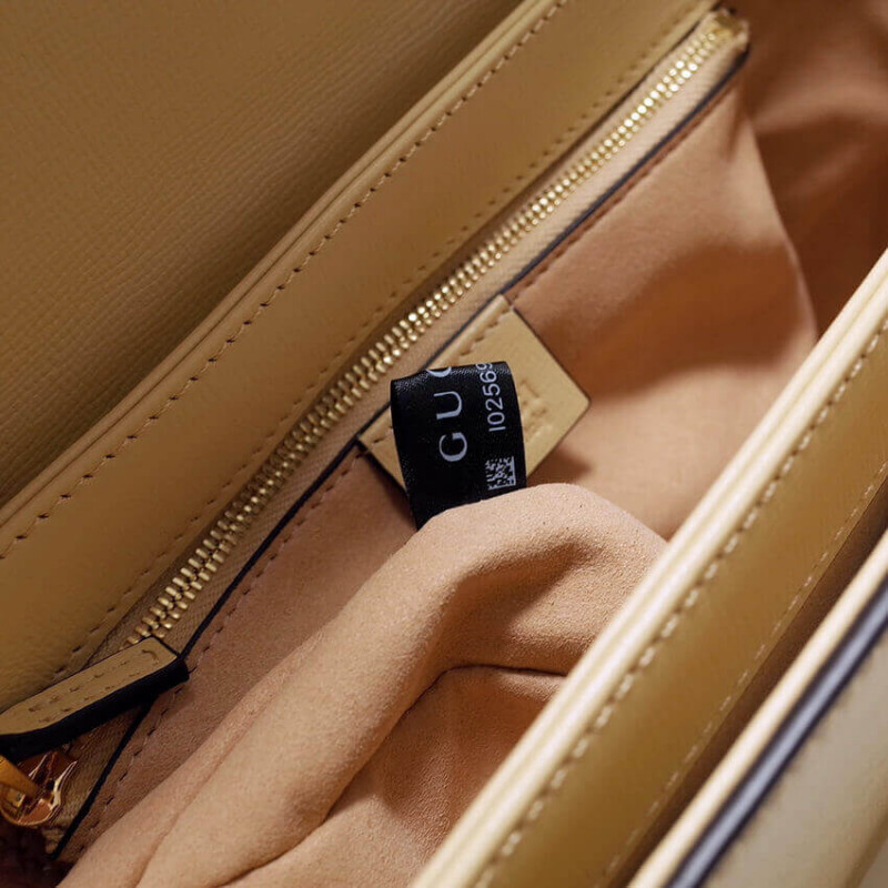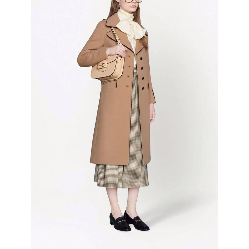 Introduzido para o Cruise 2020, a bolsa Gucci 1955 Horsebit é recriada a partir de um design de arquivo. Com as mesmas linhas e formulários introduzidos pela primeira vez há mais de seis décadas, o acessório unifica os detalhes originais com um espírito moderno, destacando o Horsebit. Parte do código genético da Gucci, o design de anel duplo e barra foi estabelecido como um dos elementos mais distintos entre os símbolos da casa emprestados do mundo equestre. Apresentado em uma pequena bolsa de ombro de aba, o hardware é emparelhado com couro marrom texturizado e concluído com um mecanismo especial que ajusta o comprimento da alça de ombro para que possa ser transportado em um ombro ou corpo cruzado.