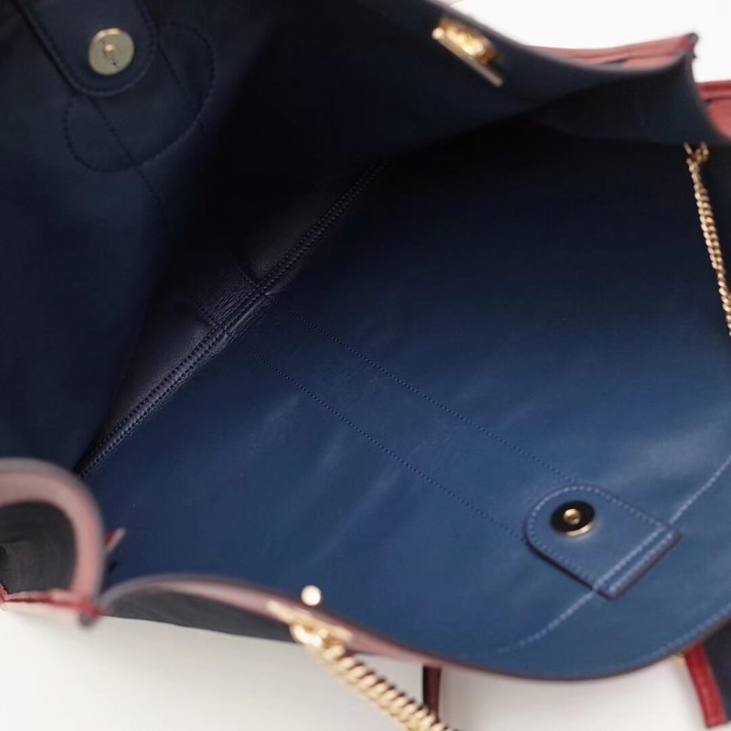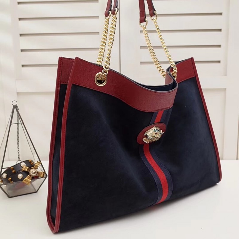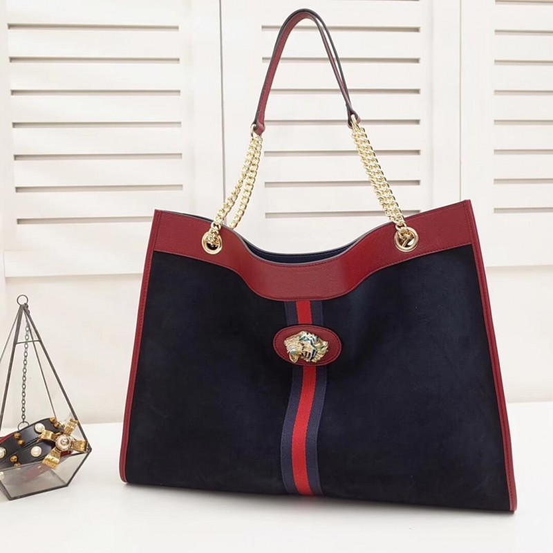 Um motivo recorrente desta temporada, a cabeça do tigre terminou com esmalte colorido e cristais espumantes é inspirada em uma peça vintage da lendária arquivos dos anos 40 de designer de moda e jóias Hattie Carnegie. Para o inverno de outono de 2018, os detalhes chegaram a definir uma nova linha de bolsas de inspiração retrô, incluindo esta bolsa de camurça marrom, aparada em couro de patente preta e aprimorado pela embutida verde e vermelha na frente.