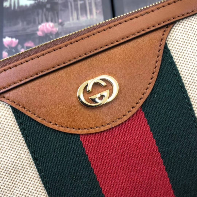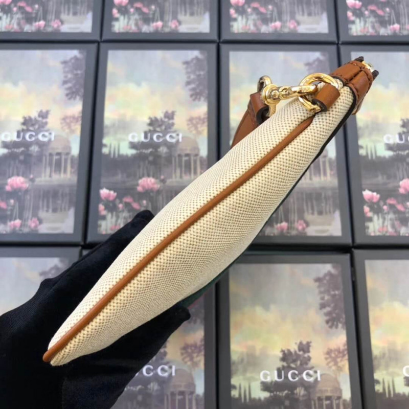 Esta bolsa elegante é criada de tela bege com uma faixa da web verde e vermelha verde e vermelha e um logotipo GG interligado dourado na frente. A bolsa possui acabamentos de couro marrom dourado e uma pulseira opcional e combinando com hardware dourado. O zíper superior abre para um interior de tecido verde pálido.