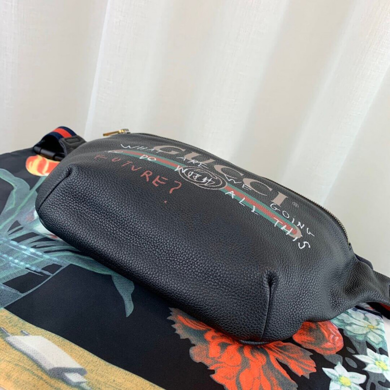 Inspirado em impressões vintage dos anos oitenta, o logotipo da Gucci é trazido à tona. O motivo do estilo retrô é apresentado na frente de um saco de cinto em couro flexível e texturizado. Web