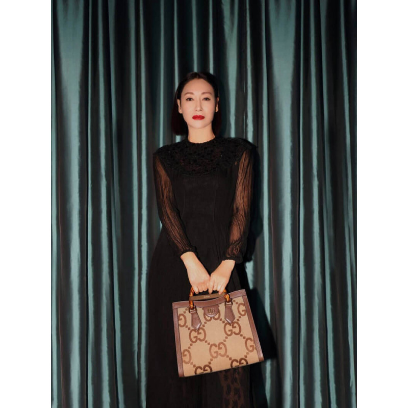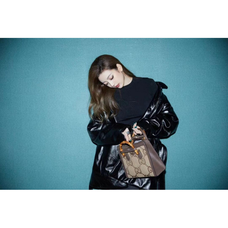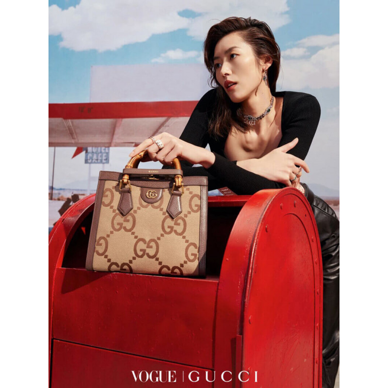 Emblemas instantaneamente reconhecíveis da marca, os logotipos enriquecem os designs de maneiras novas e inesperadas. Por trás de cada logotipo está a tradição e o valor da casa, um meio eterno pode usar repetidamente. Seguindo a idéia de mudança e experimentação constantes, diferentes iterações do logotipo foram apresentadas a cada coleção. O Jumbo GG, uma nova versão maximalista do monograma histórico, anima uma seleção de prontos para vestir e acessórios para a coleção Aria. Esta pequena sacola Gucci Diana é concluída por um acabamento de couro marrom.