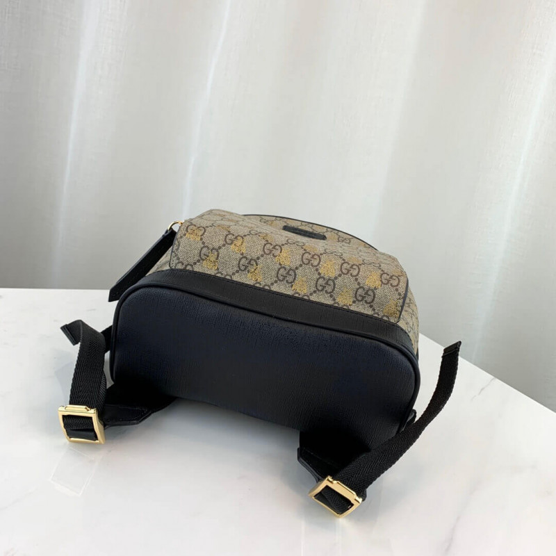 Uma pequena mochila no motivo GG, enriquecida com o símbolo histórico de Beesa, impressa em ouro, dos arquivos da casa, primeiramente continuado na década de 1970. Impressão de abelhas, um material com baixo impacto ambiental