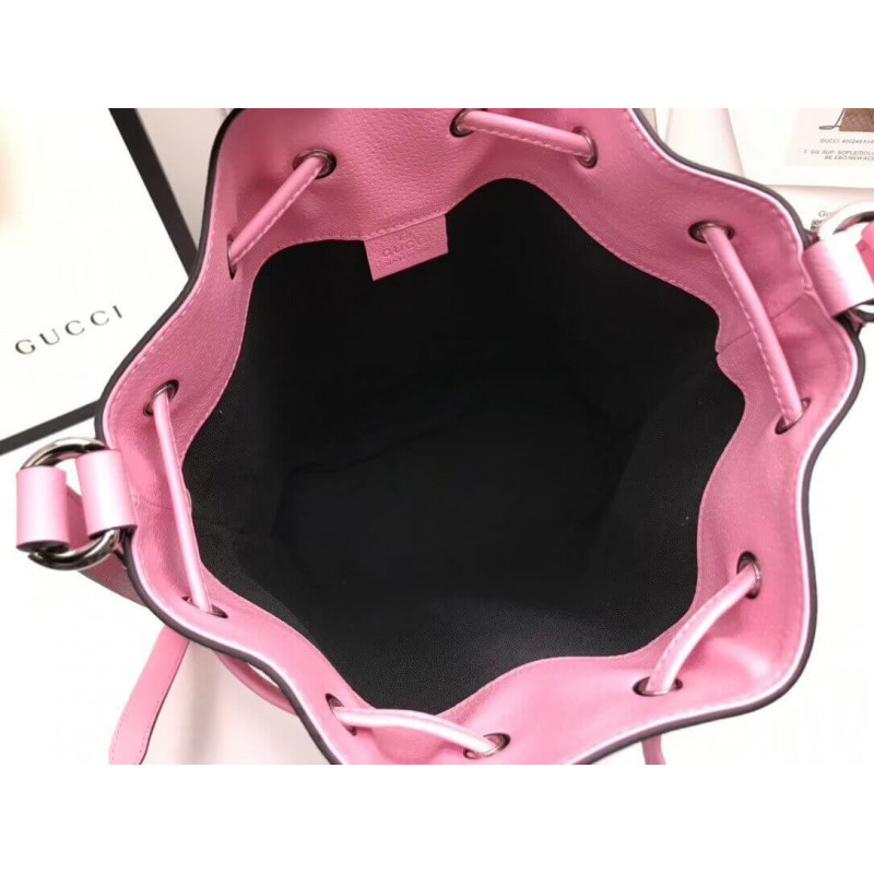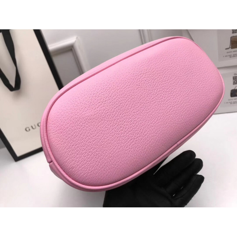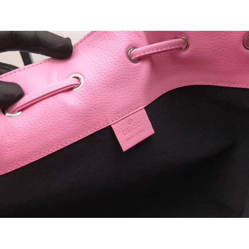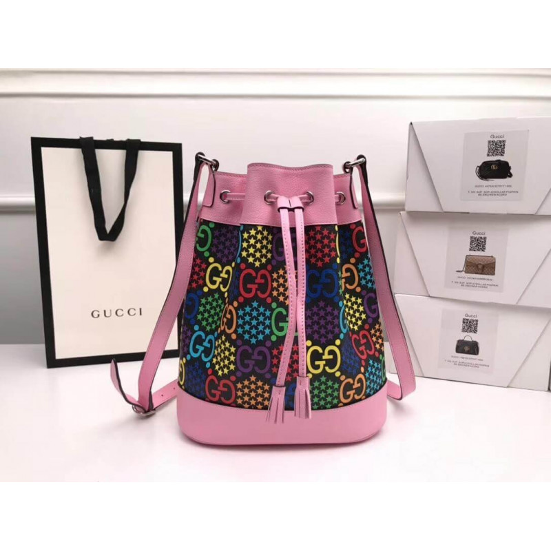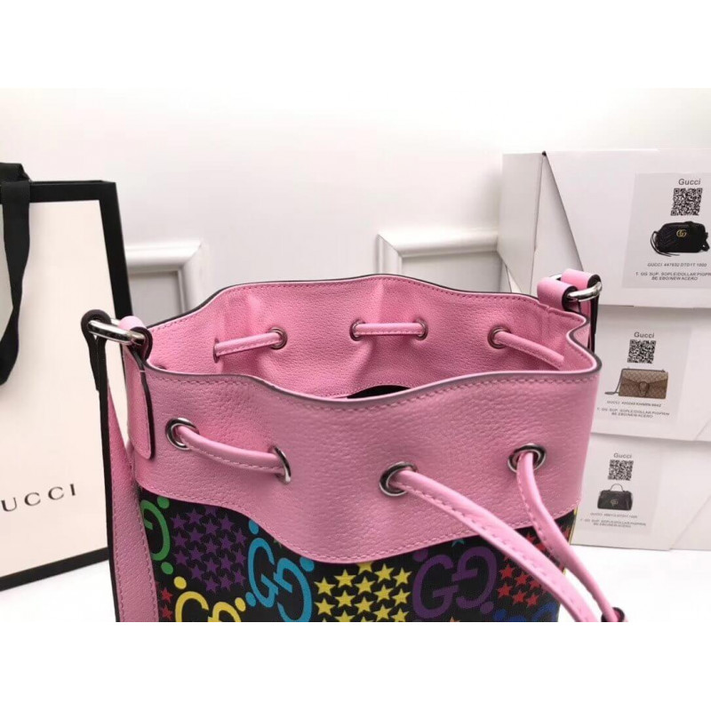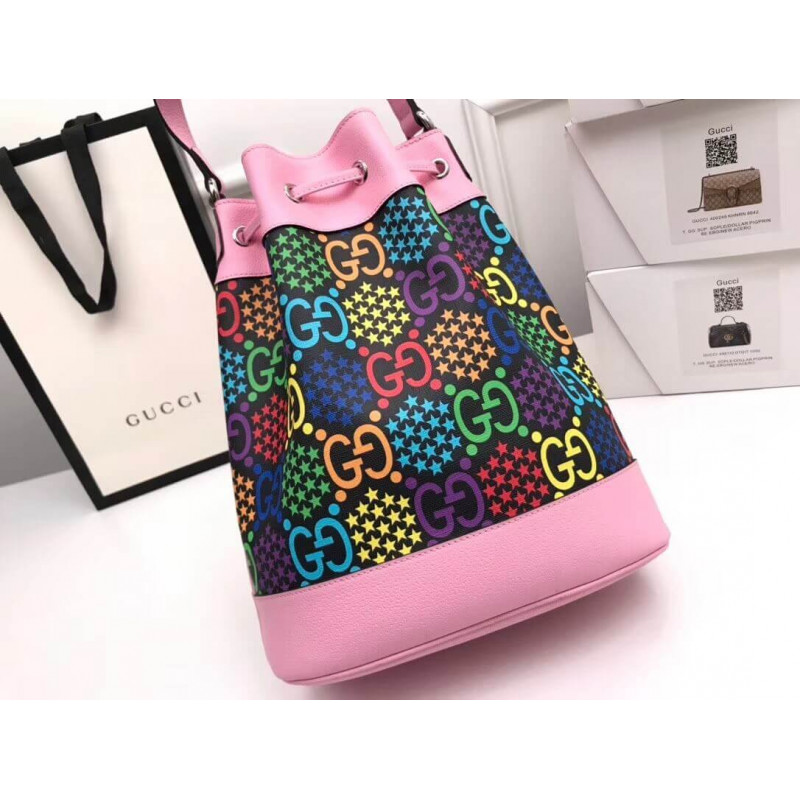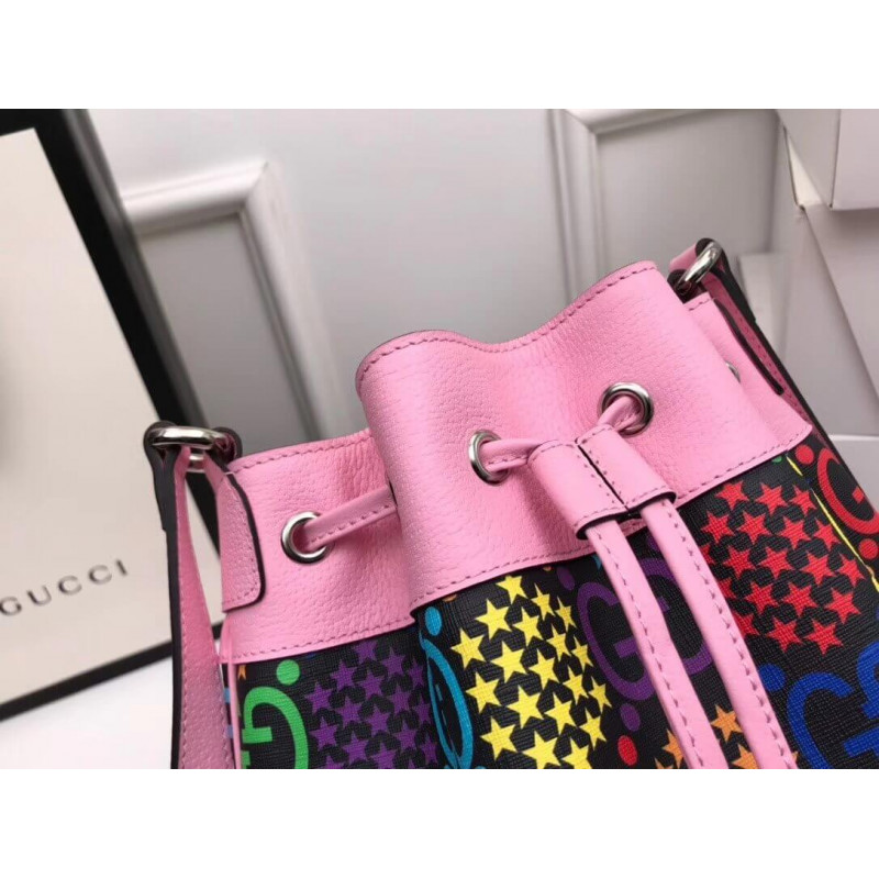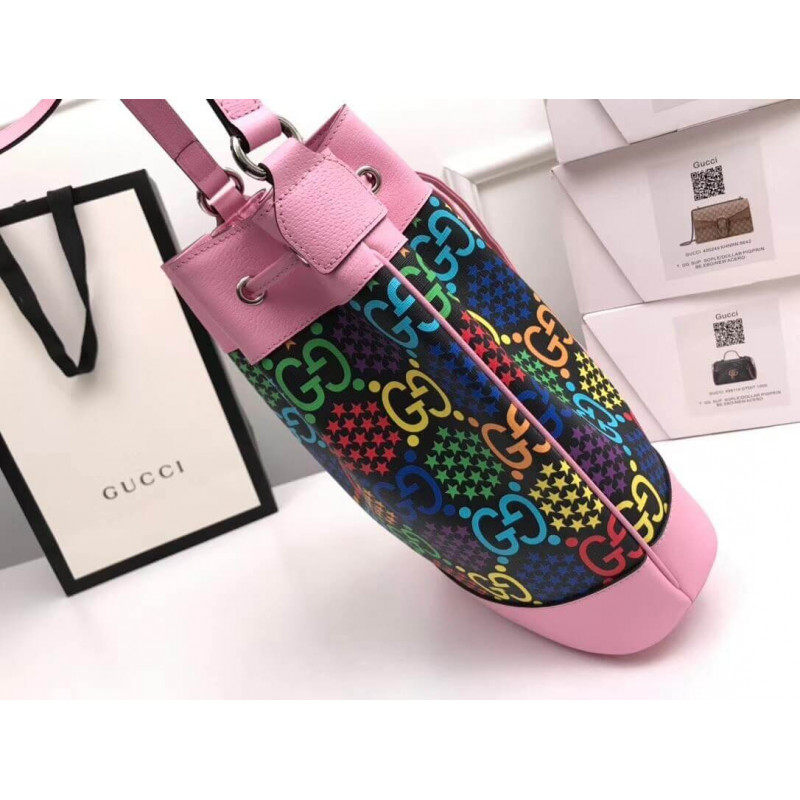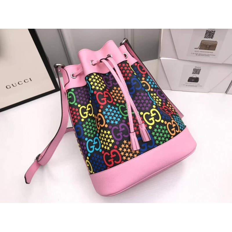 Uma visão moderna do padrão histórico de GG, o Motif Psicodélico GG decora formas clássicas em toda a coleção Cruise 2020, incluindo a bolsa com fechamento de cordão. Visto em todo o vestuário e acessórios, o monograma é apresentado em tons de sombra com um design de estrela que cria um efeito holograma, aparado aqui com couro rosa brilhante.