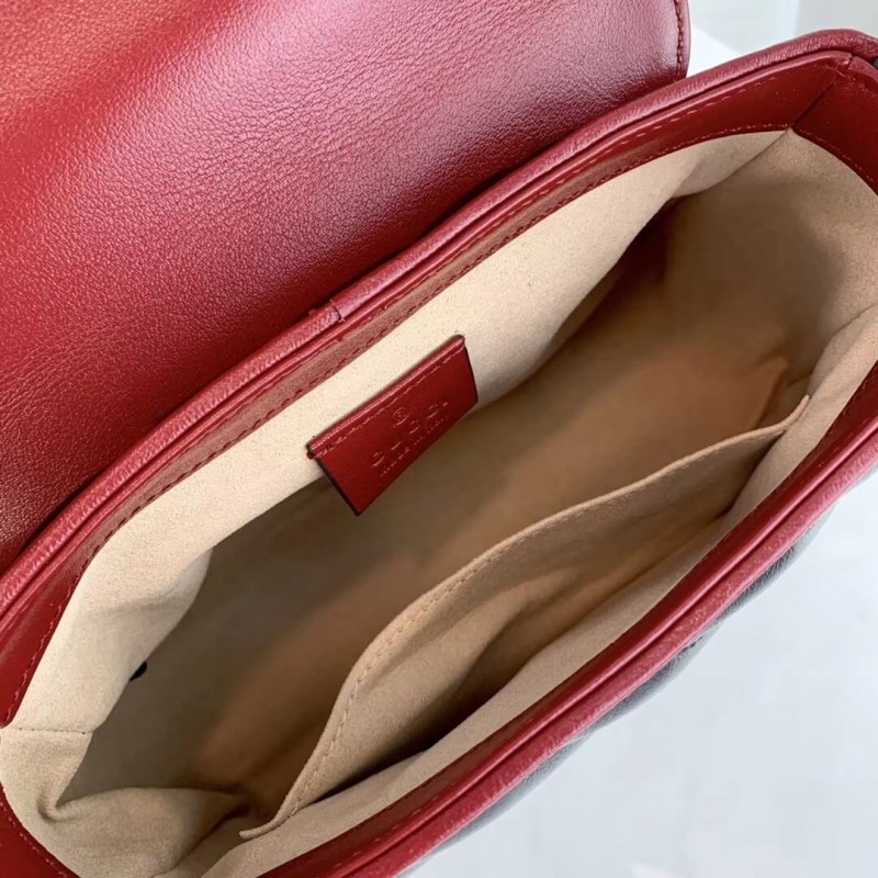 A bolsa GG Marmont é reimaginada para o pré-outono de 2019, feita de couro acolchoado da Matelasse Black diagonal e concluído com um enfeite de duplo G Twisted Torchon. A forma distinta de mini alça superior da alça superior é delineada em tubulação de cerise em contraste, destacando seu fechamento de aba de grandes dimensões. Uma alça de corrente removível permite que a forma da sacola também seja usada como uma bolsa de ombro.