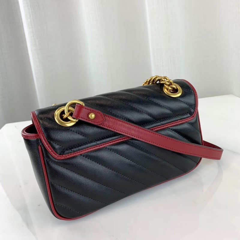 A bolsa GG Marmont é reimaginada para o pré-outono de 2019, feita de couro acolchoado da Matelasse Black diagonal e concluído com um enfeite de duplo G Twisted Torchon. A forma distinta suavemente estruturada da bolsa de corrente de pequena corrente é descrita em tubulação em contraste, destacando seu fechamento de retalho. A pulseira de corrente deslizante se transforma suavemente de um único comprimento do ombro em um comprimento de alça superior duplicado para várias maneiras de usar a bolsa.