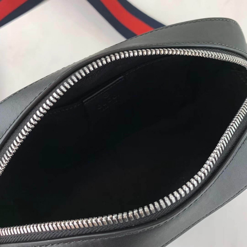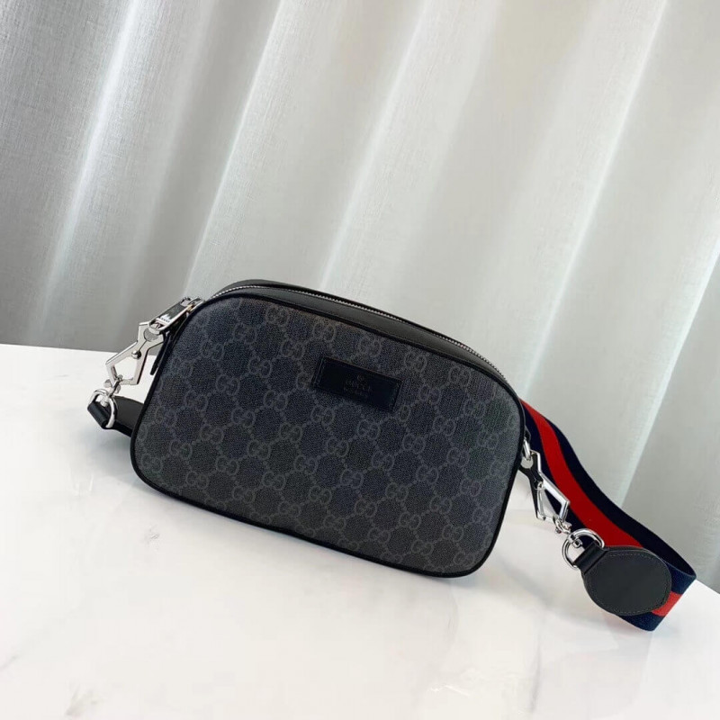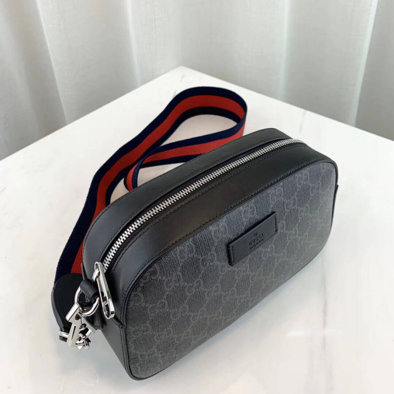 Gucci Messenger Bag com preto/cinza Soft GG Supreme com acabamento em couro preto, detalhe de couro da linha frontal de marca registrada G-Ucci, fixação com zíper superior, bolso plano interno, Blu e Red Web Web Strape. cm.