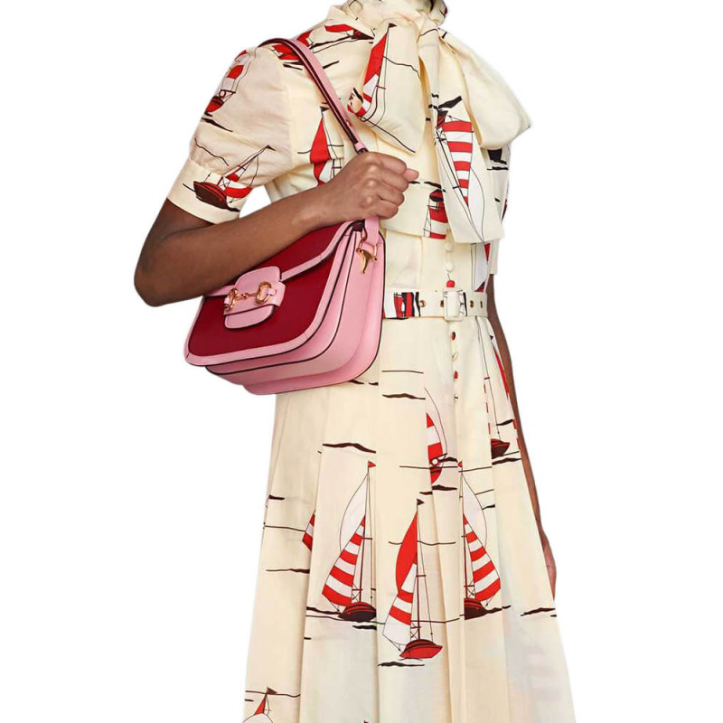 Uma parte das amadas linhas da casa, o hardware homônimo da Gucci Horsebit 1955 é complementado por couro tonificado Ruby com um acabamento rosa pastel. Os tons de jóias aparecem em toda a coleção de ouverture, ligando as linhas caras à mangueira com pedras e gemas preciosas.