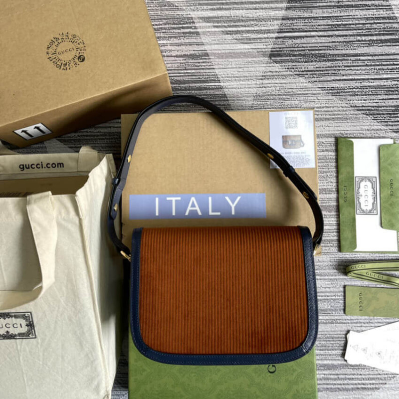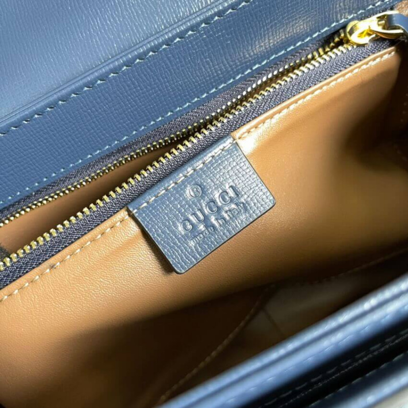 Recriado a partir de um design de arquivo, a bolsa Gucci Horsebit 1955 é introduzida em cordão rosa com um acabamento em couro azul contrastante. Com as mesmas linhas e formulários introduzidos pela primeira vez há mais de seis décadas, o acessório unifica os detalhes originais com um espírito moderno, destacando o Horsebit. A pequena bolsa de ombro de aba é concluída com um mecanismo especial que ajusta o comprimento da alça do ombro para que possa ser transportado em um ombro ou corpo cruzado. [BR]]acabamento em couro azul