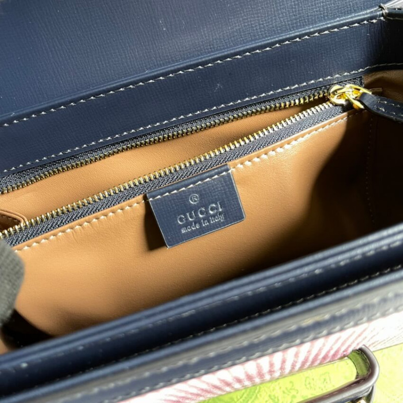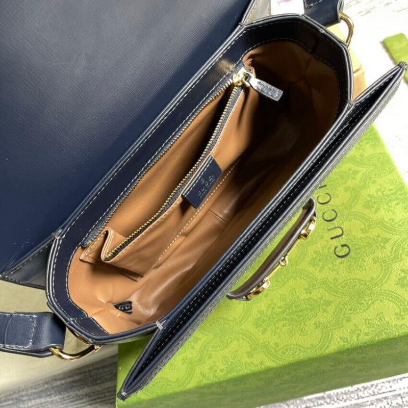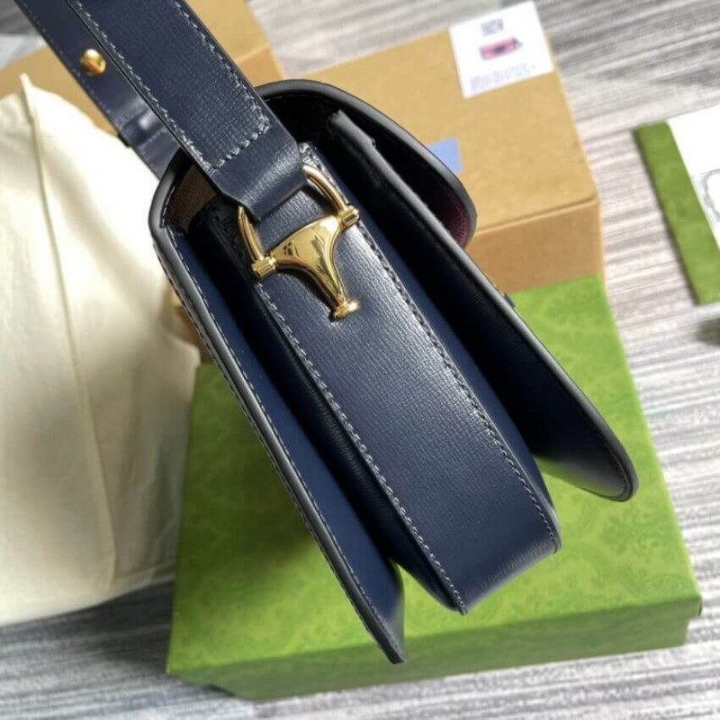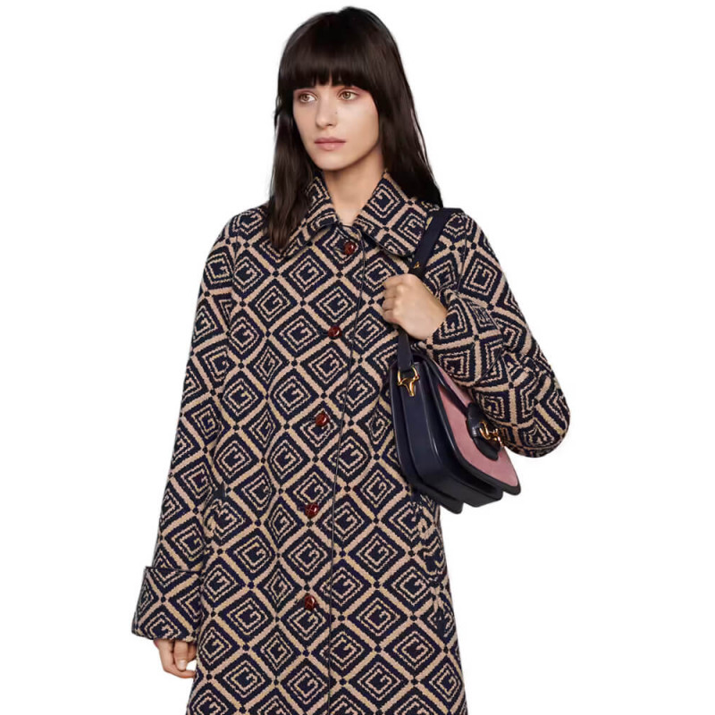 Recriado a partir de um design de arquivo, a bolsa Gucci Horsebit 1955 é introduzida em cordão rosa com um acabamento em couro azul contrastante. Com as mesmas linhas e formulários introduzidos pela primeira vez há mais de seis décadas, o acessório unifica os detalhes originais com um espírito moderno, destacando o Horsebit. A pequena bolsa de ombro de aba é concluída com um mecanismo especial que ajusta o comprimento da alça do ombro para que possa ser transportado em um ombro ou corpo cruzado. [BR]]acabamento em couro azul