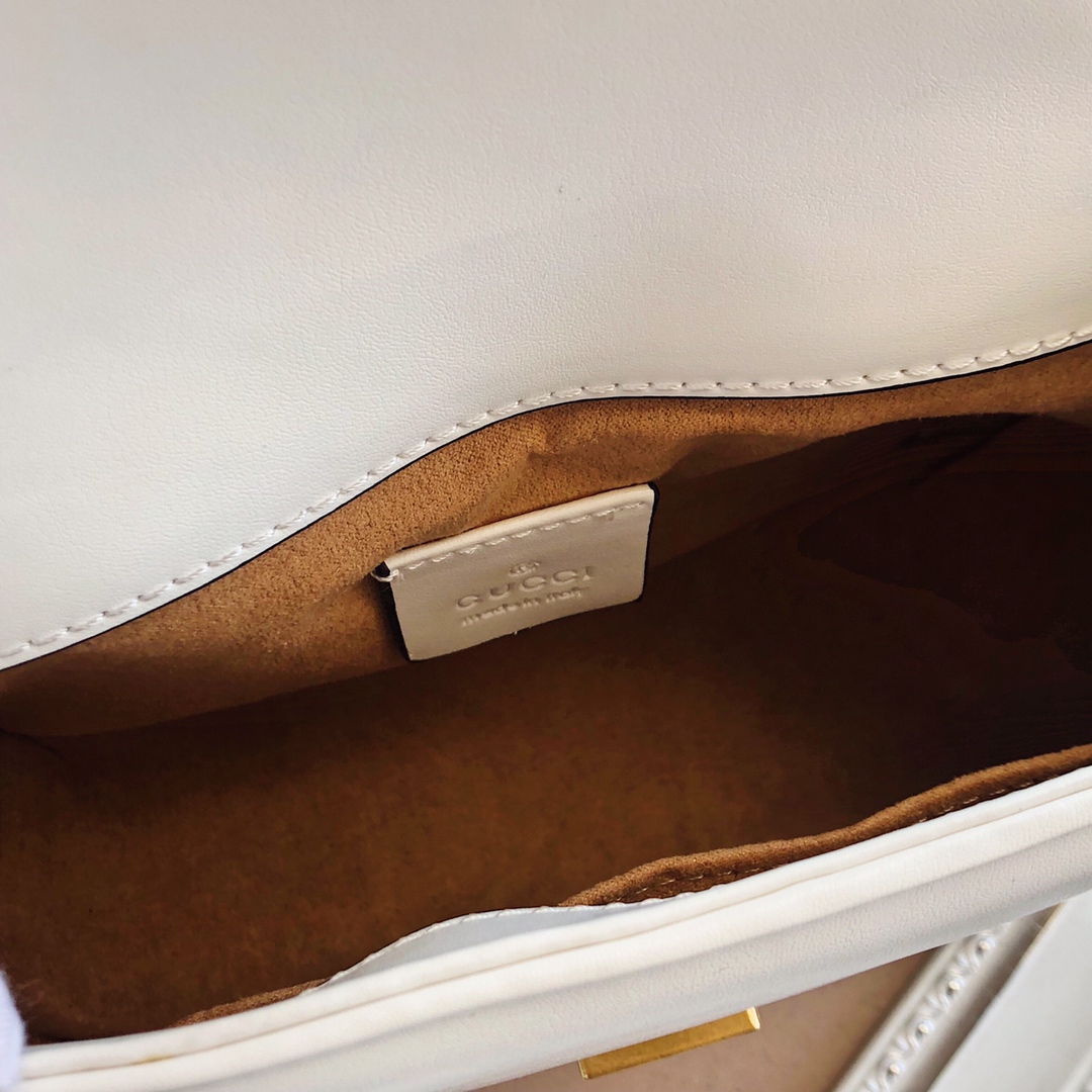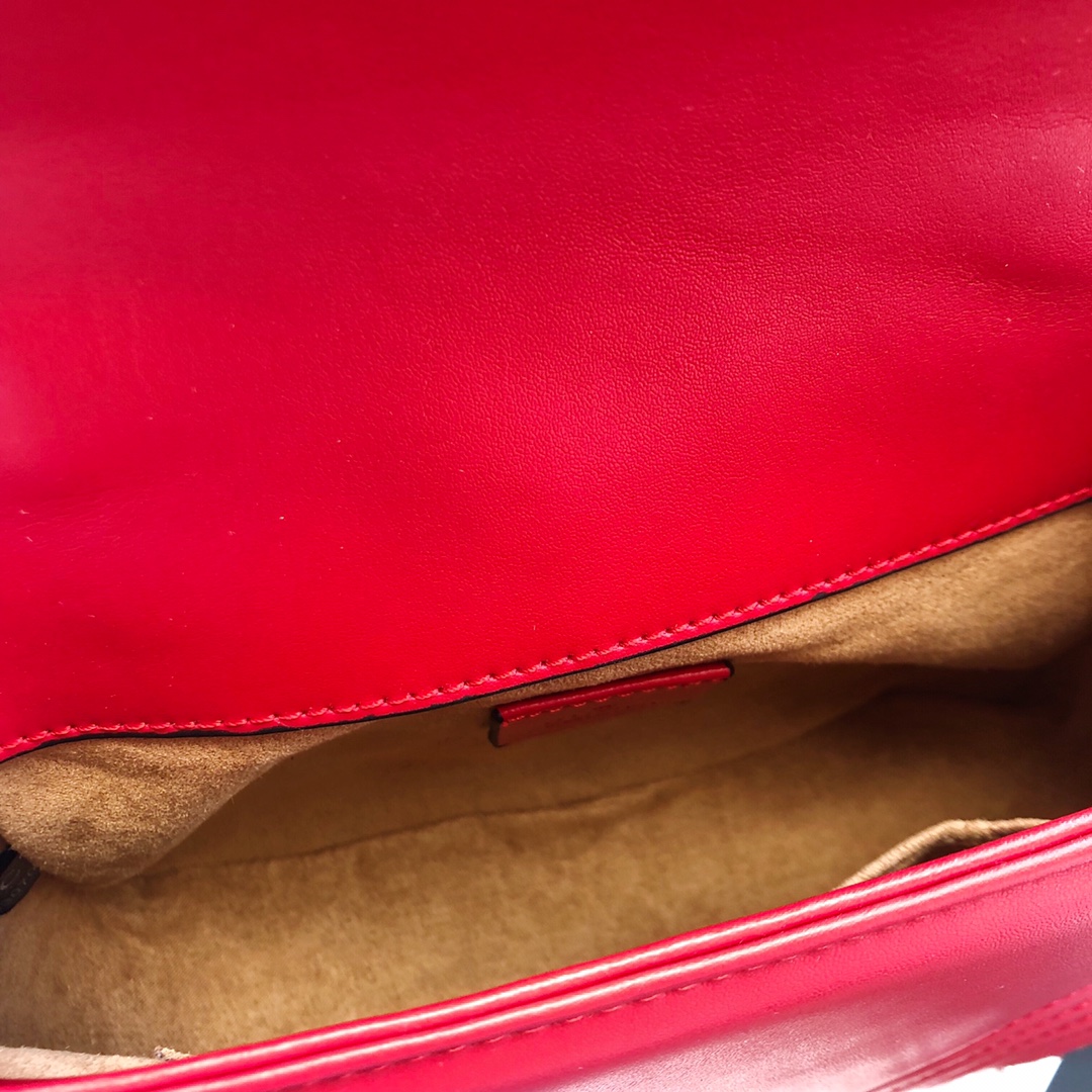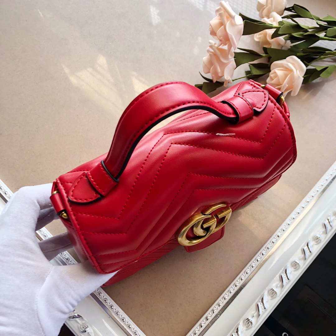 O Mini GG Marmont Top Handle Bag tem uma forma suavemente estruturada e um fechamento de aba de grandes dimensões com hardware duplo G. Equipado com uma alça superior de couro e alça de ombro em corrente, feita em couro Chevron Matelassé com um coração nas costas.