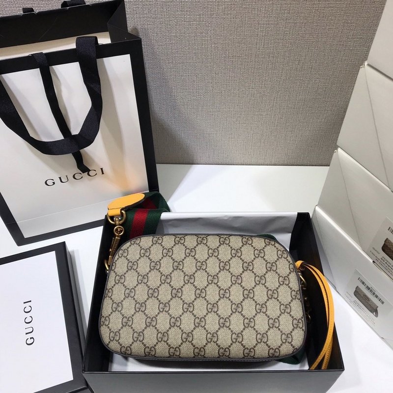 Uma coleção de malas de inspiração vintage fala com o Voyager contemporâneo, aparado com a listra da Web House. Feito na tela suprema GG, esta bolsa de mensageiros de câmera tem detalhes de couro amarelo. Os acabamentos em contraste prestam homenagem ao passado da casa, quando os artesãos reparavam a bagagem substituindo áreas desgastadas por novas em qualquer cor disponível.