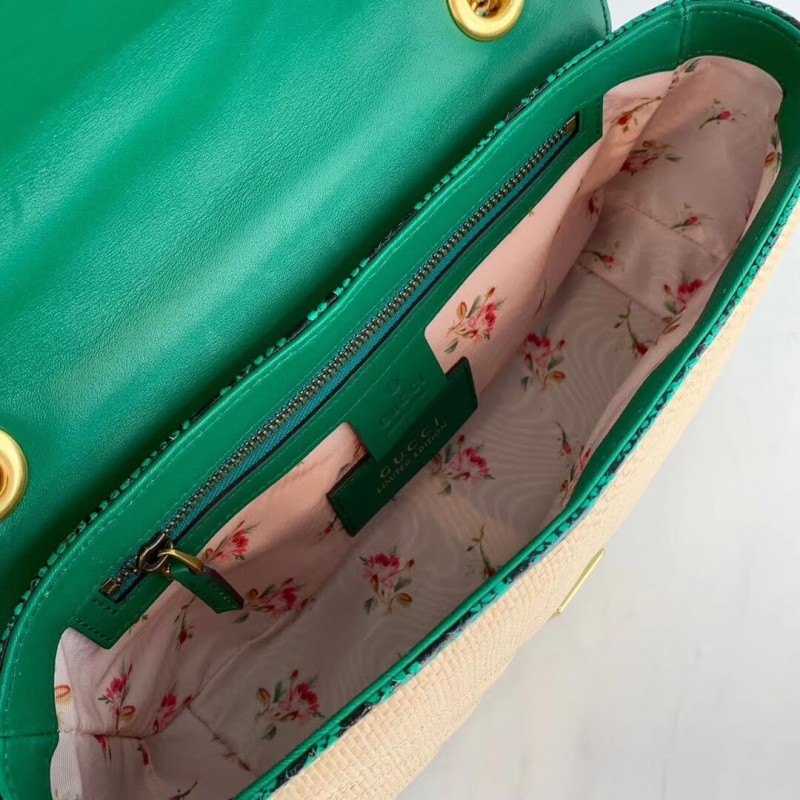 A linha distintiva de GG Marmont é enriquecida para 2019 antes do outono com uma nova iteração em Raffia com acabamento em pele de cobra em tons vívidos. A silhueta cobiçada é definida pelo design da Chevron Matelasse da linha com um coração nas costas e o fechamento duplo G. Novas formas e linhas Gucci de assinatura são reimaginadas em uma mistura de tecidos e acabamentos imbuídos de uma sensação inerentemente no verão. Green Snakeskin Trim