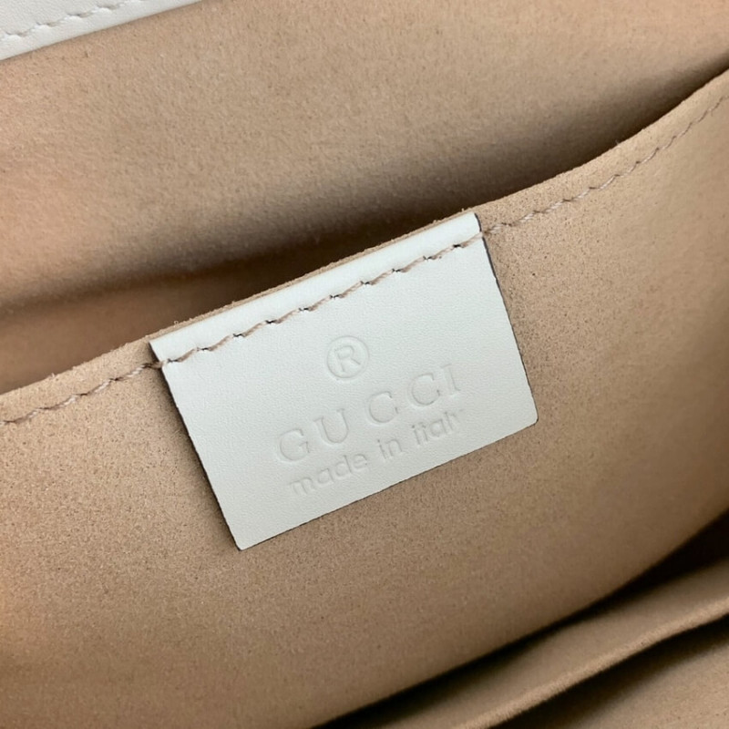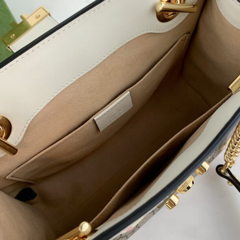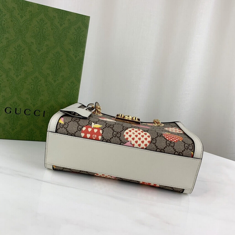 Frutas e vegetais se tornaram os atuais elementos de design de moda da marca, injetando total vitalidade na nova série, interpretando vividamente o humor inocente e divertido da marca. Esta pequena bolsa de ombro da série de cadeados usa um padrão de maçã Gucci Heart interessante para ecoar o tema.