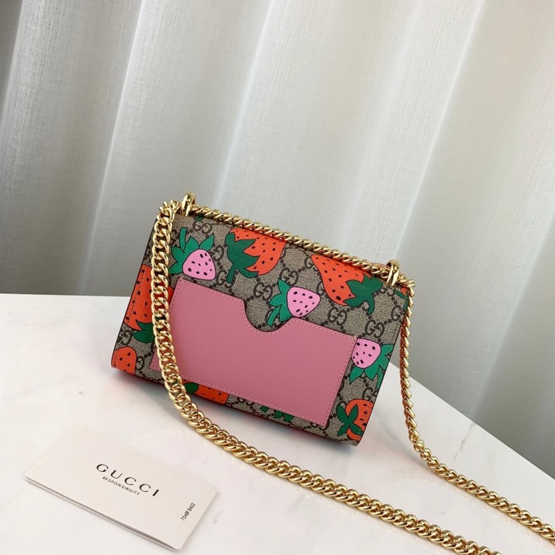 Uma versão lúdica da pequena bolsa de ombro de cadeado é retratada com a estampa de morango colorida da temporada. A representação vívida e ricamente gráfica de morangos vermelhos e rosa e o logotipo Gucci se destacam contra o fundo supremo GG. Concluído com uma alça de corrente deslizante que transforma o estilo de uma bolsa de ombro em uma alça superior.