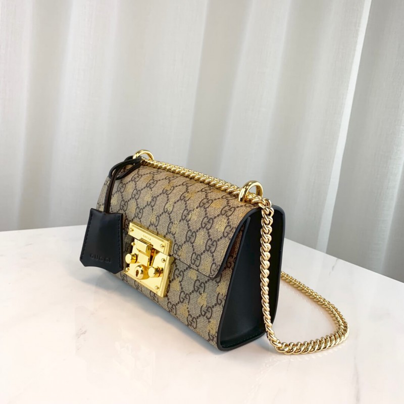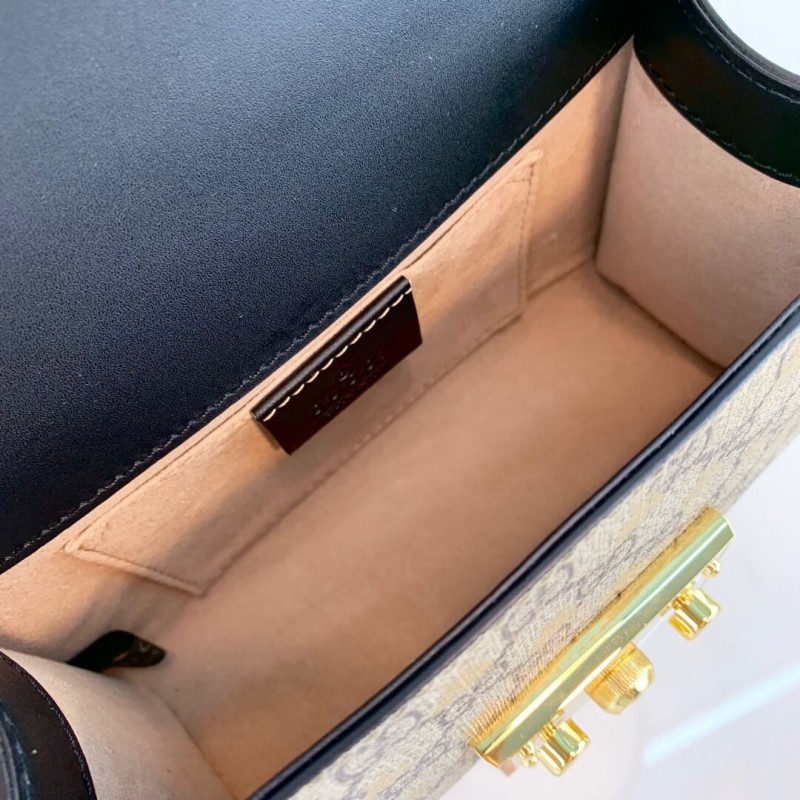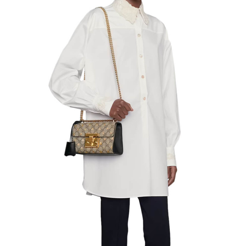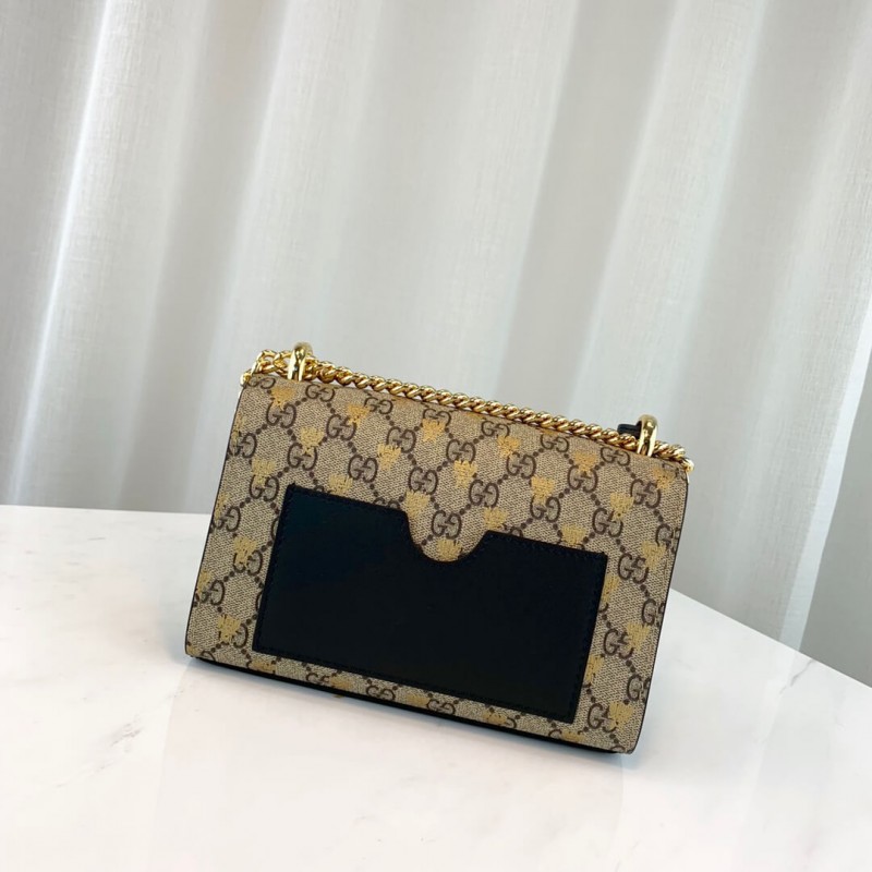 Uma pequena bolsa de ombro estruturada com um fechamento de fechadura -chave puxado dos arquivos, a chave é colocada em uma caixa de chave de couro que se volta ao redor da corrente. A alça de corrente deslizante pode ser usada de várias maneiras, mudando entre um ombro e um saco de alça superior. Feito na tela suprema GG enriquecida com o símbolo histórico de Beesa impressa em ouro dos arquivos da casa, introduzido pela primeira vez na década de 1970.