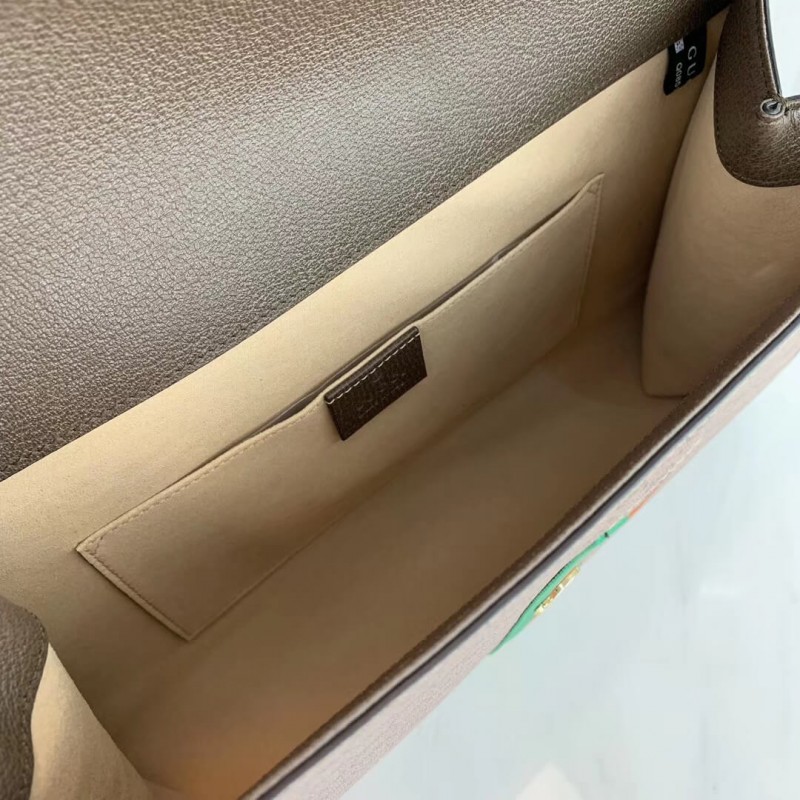 Uma adição à linha Rajah para a primavera do verão de 2019, a bolsa de ombro médio é introduzida no Mini GG Supreme Canvasa, nova visão do padrão de assinatura com um visual vintage que é aumentado com a teia verde e laranja. Apresentando o esmalte colorido e a cabeça do tigre de cristal colorido da coleção, inspirado em uma peça vintage do lendário designer de moda e jóias Hattie Carnegie os arquivos da década de 1940, a bolsa é projetada com duas tiras: uma correia curta e uma pulseira mais longa na assinatura da casa e verde da casa e vermelho Cores da teia. ]]hardware brilhante em tons de ouro