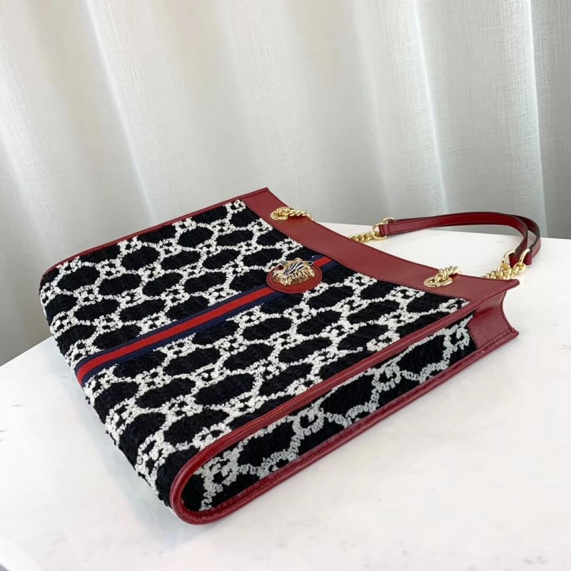A bolsa Rajah é reintroduzida para o pré-queda de 2019 em Black GG Tweed, aparado com couro Cerise e a Web House. Imbued de uma sensação de feminina inerente, o Tweed continua a definir uma ampla gama de estilos Gucci. A linha é definida pela cabeça do tigre, com esmalte colorido e cristais espumantes, inspirados em uma peça vintage da lendária designer de moda e jóias Hattie Carnegie nos anos 40. GG White Tweed
