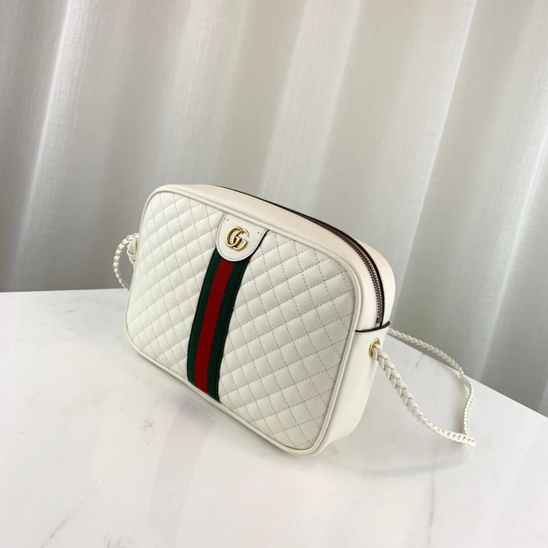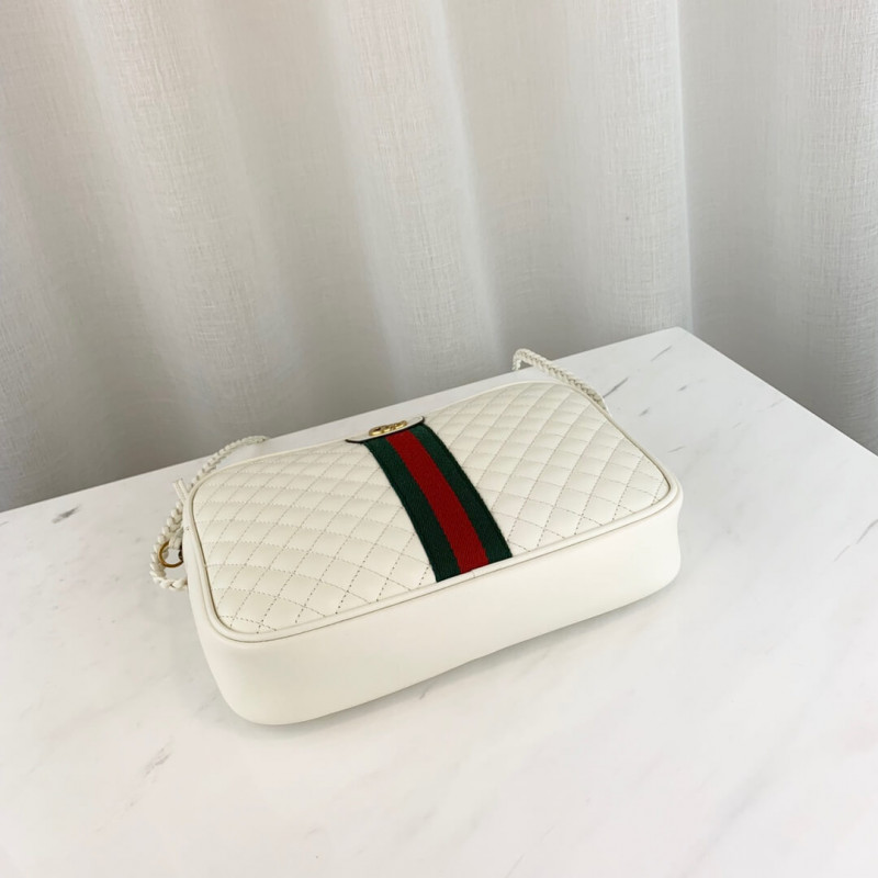 A pequena bolsa de ombro de couro em couro acolchoado mistura uma sensação de roupas esportivas com emblemas distintos da casa. O couro brilhante é contrastado com a tradicional listra verde e vermelha e hardware duplo G.