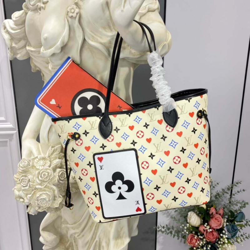 Para o Cruise 2021, Nicolas Ghesquiere se moda a bolsa Neverfull MM em um jogo transformado na tela do monograma. O motivo multicolorido substitui algumas das flores do monograma por corações vermelhos. Na frente externa da bolsa, há um bolso útil de cartão de jogo. A bolsa inclui uma bolsa com zíper removível, cujo design também mostra a influência das cartas de jogo.