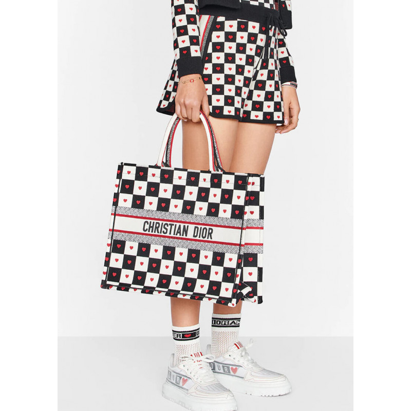 O Dior Book Tote, parte da cápsula de Dioramour, é uma criação original introduzida pela diretora criativa da Dior, Maria Grazia Chiuri, e se tornou um item básico da estética da Dior. O design faz parte da cápsula de dioramour e é totalmente bordado com o motivo do coração preto, branco e vermelho D-chess, adornado com a assinatura da Dior Christian na frente. A pequena bolsa exemplifica a assinatura da casa Savoir-Faire e pode ser transportada à mão ou usada por cima do ombro. BR]]Christian Dior ‘Signature na frente