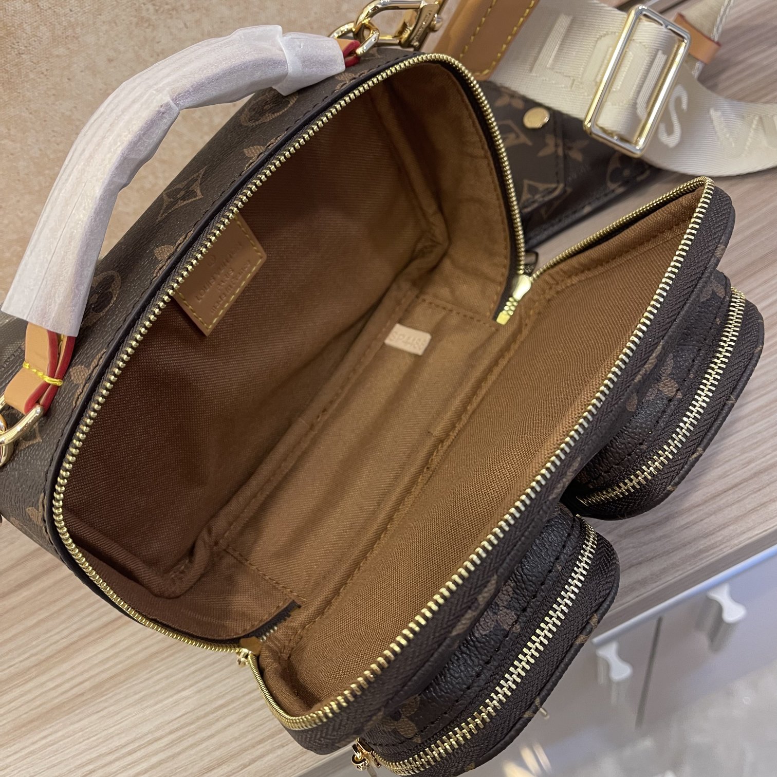 A bolsa esportiva de crossbody é feita de tela de monograma com uma alça superior e puxões com zíper em couro natural. Uma bolsa muito funcional, possui vários bolsos externos para acesso rápido aos pertences. Sua forma compacta o torna leve, enquanto a alça ampla ajustável significa que é confortável de transportar.