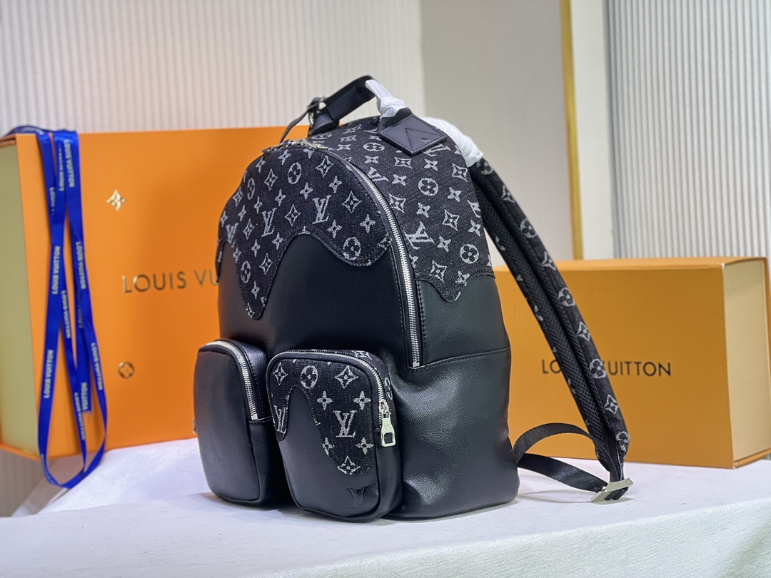 Para sua segunda colaboração da Louis Vuitton, o designer japonês NIGO atualizou a mochila multipocket com seu visual de gotejamento de monograma: o icônico padrão de monograma no jeans preto “fluindo” em couro de Taurillon de grão fino. Esta bolsa prática possui vários bolsos e um compartimento principal grande o suficiente para um laptop, além de uma etiqueta em forma de coração vermelho brilhante para um toque de assinatura atraente. Backpack multipocket