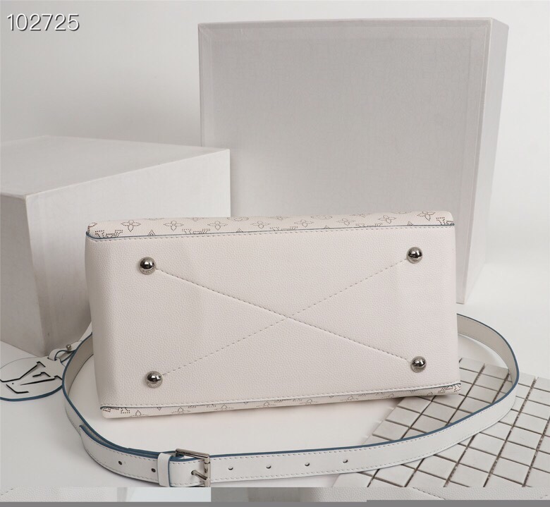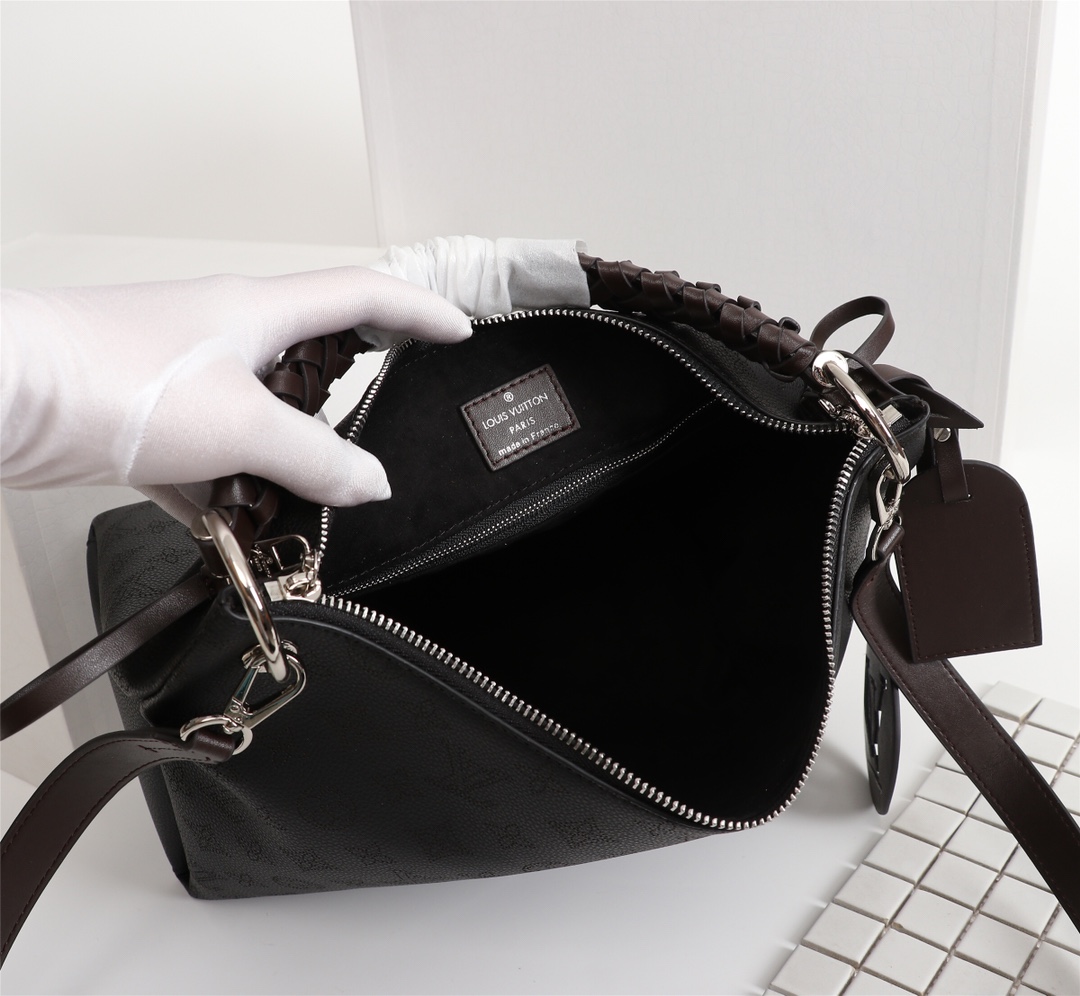 A bolsa Hobo MM do LV Beaubourg é feita de couro de bezerro Mahina perfurado com o padrão de monograma. Possui uma alça superior de couro trançado elegante, com o tingimento de arestas pintado à mão ao longo das tranças. O zíper de couro puxa e o grande charme do LV assinam a bolsa. Uma alça de couro larga e destacável significa que essa bolsa flexível se sente confortável contra o corpo.