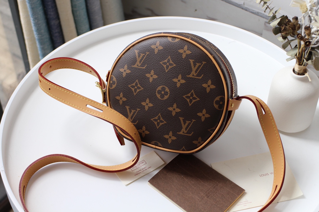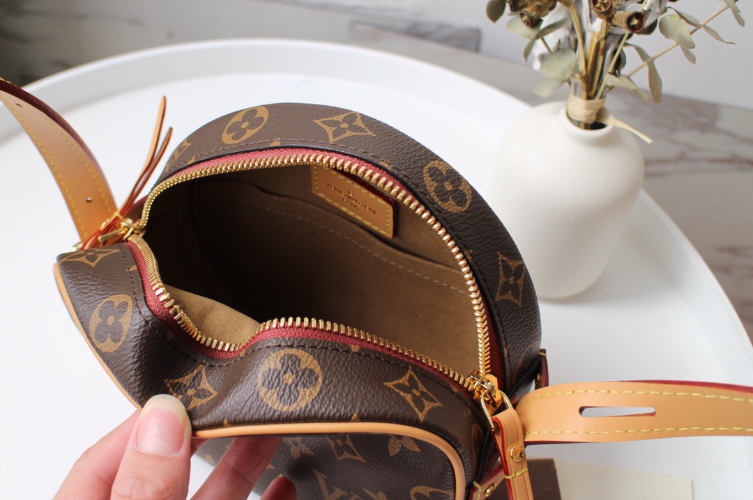 Inspirada na herança de viagem de Louis Vuitton, Nicolas Ghesquière criou esta versão em miniatura do bo? Te Chapeau Souple. Na tela do monograma com acabamento natural de couro, emana da elegância casual. Uma bolsa leve e compacta de “hatbox” com muito espaço para manter o essencial-perfeito para o estilo de vida de hoje. Boite Chapeau Souple PM M45578
