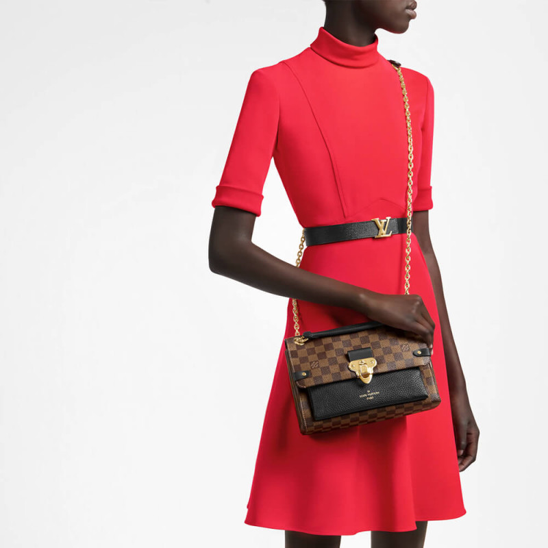 A bolsa de corrente Vavin é feita de tela de Damier Ebene, elegantemente equilibrada com couro de bezerro macio. A fechadura de acabamento de ouro é inspirado pelos encontrados nos troncos clássicos da Louis Vuitton. Luz e para o corpo, o Vavin PM é suspenso de uma alça de corrente deslizante, equipada com ombreiras de couro duplo, para um transporte confortável do dia para a noite. bezerro granulado