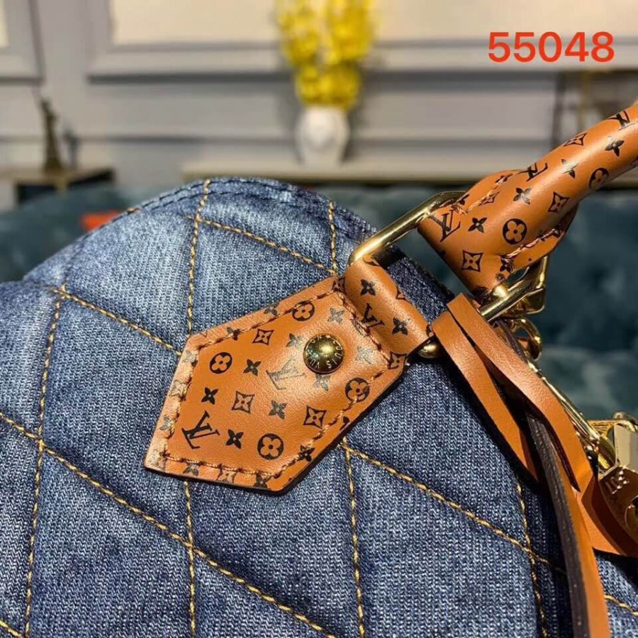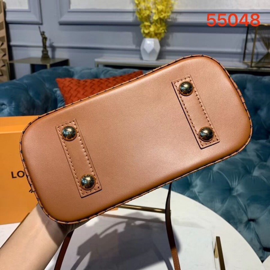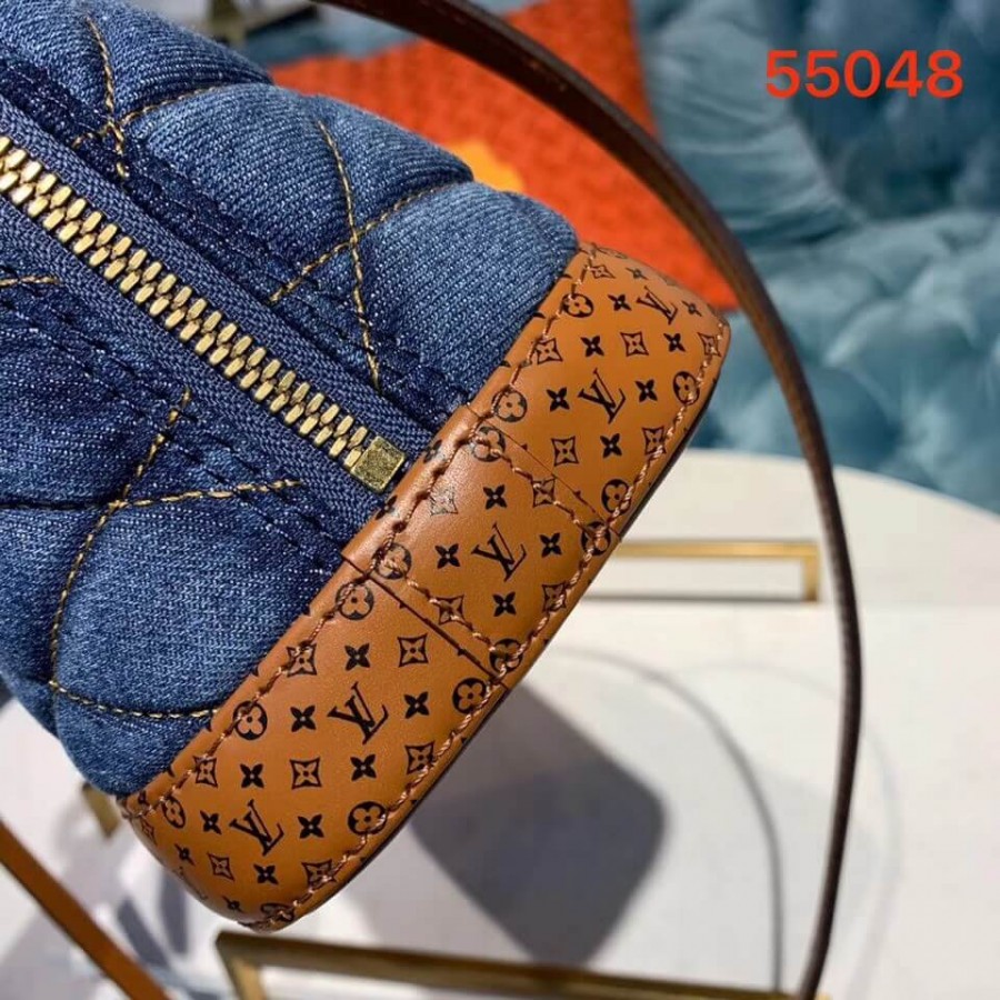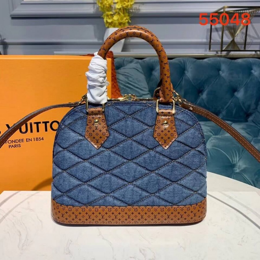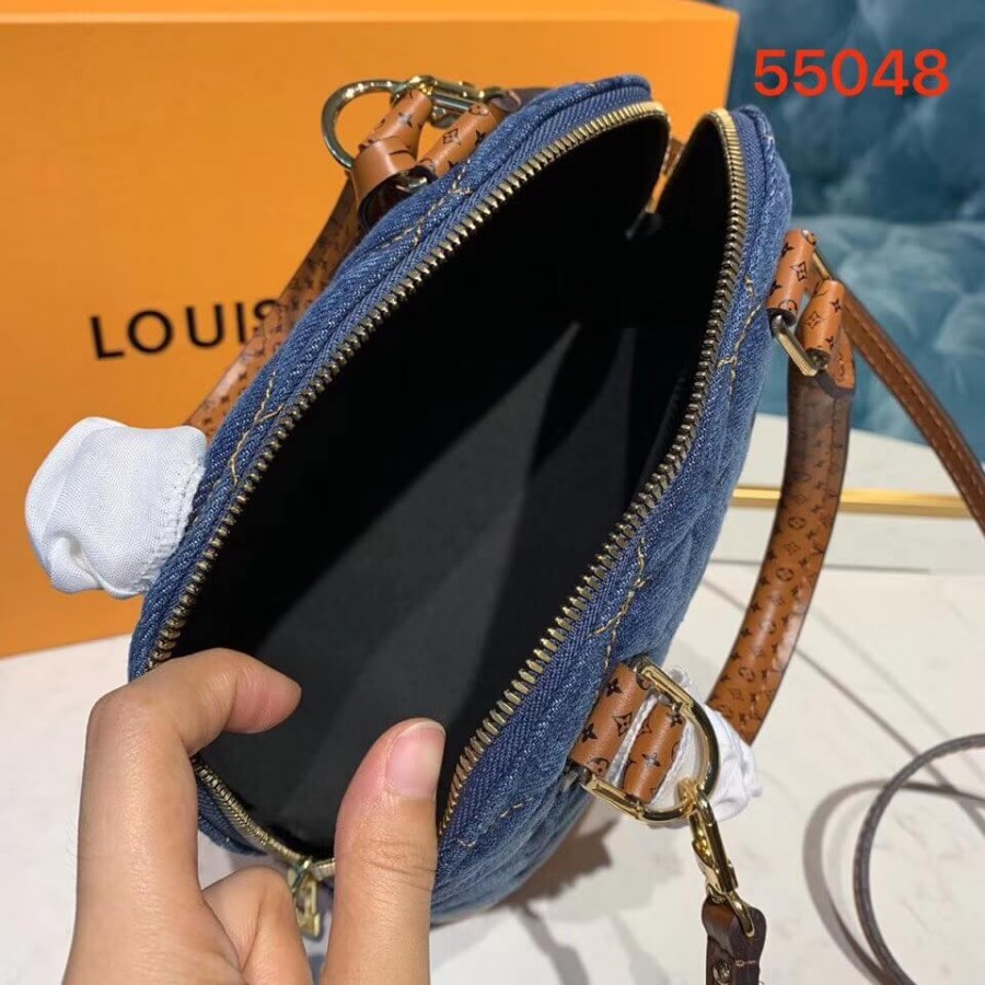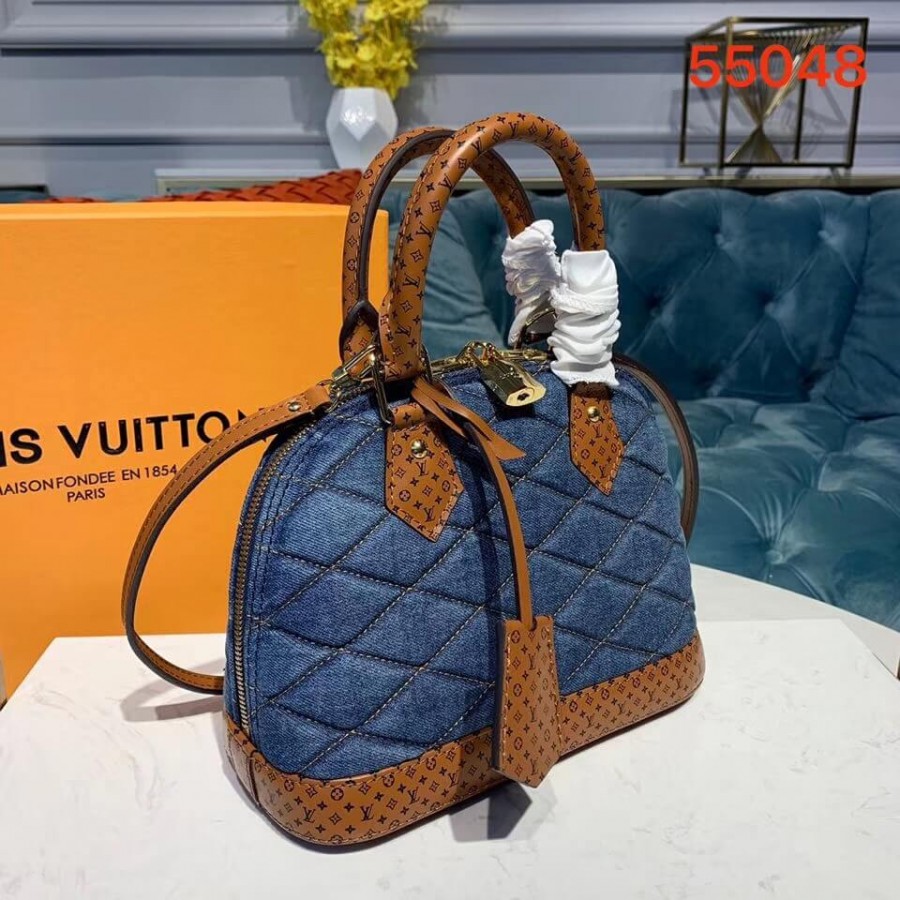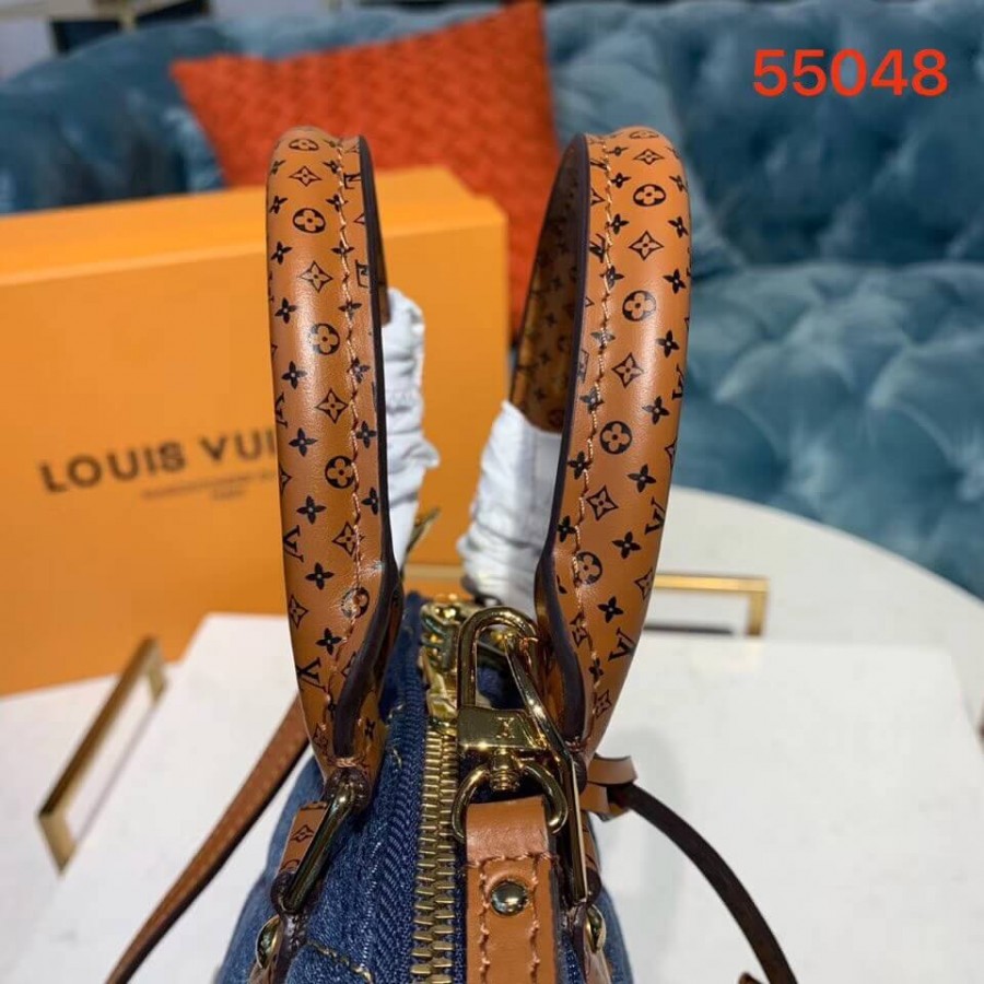 A bolsa Alma BB atemporal é atualizada para o pré-queda de 2019 com tela de jeans escura acertada em Malletage. As alças de couro bronzeado e acabamentos são impressos com um motivo ministulado de monograma, um toque de assinatura divertida. O tamanho encantador do BB pode ser estilizado de várias maneiras: transportado à mão, pendurado sobre um ombro ou corpo transversal. Encontramento de couro de panturrilha impresso