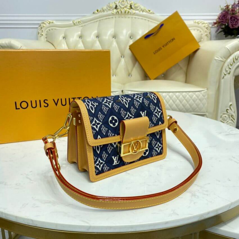 Para o inverno 2020, Nicolas Ghesquiere moda a mini bolsa Dauphine com um novo Jacquard, um padrão moderno composto por muitos dos símbolos icônicos da casa. Esta adorável bolsa compacta apresenta uma trava de LV brilhante e uma tira de couro para transporte de ombro e corpo cruzado. É perfeitamente dimensionado para o desgaste diário.
