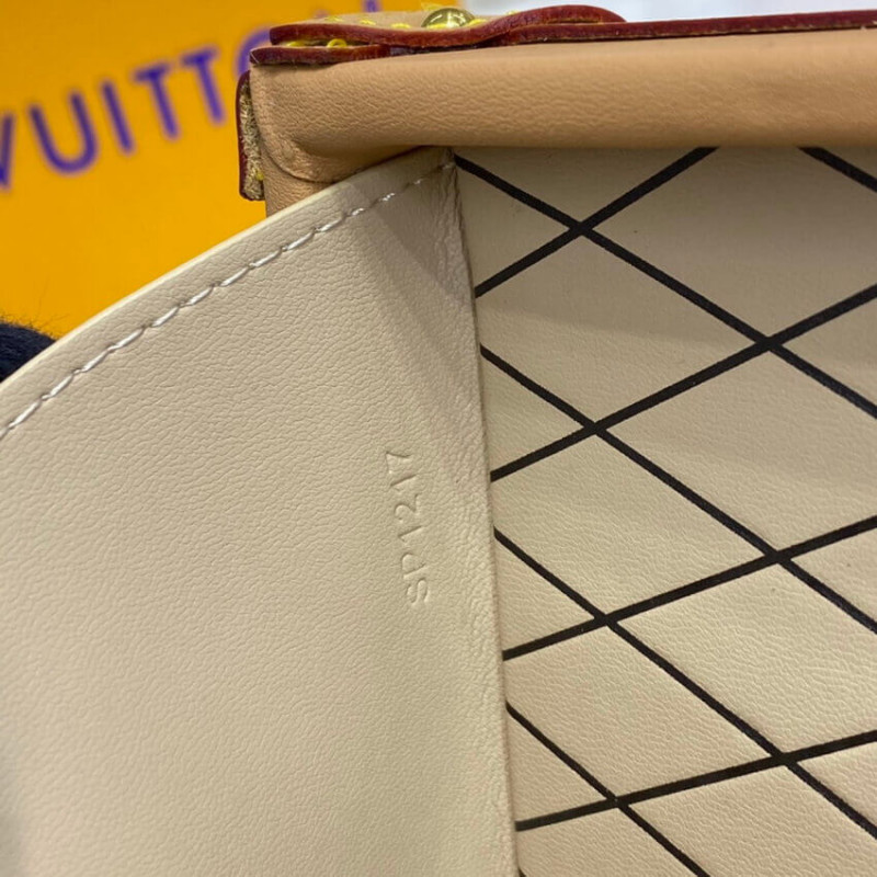 A Petite Malle Bolsa assume um aspecto neo-vintage em New Jacquard desde 1854 têxteis. O padrão de flores de monograma tecidas, iniciais do VE e 1854s foi visto em toda a coleção Fall Winter 2020. O número 1854 refere-se ao ano em que Louis Vuitton fundou seu negócio de fazer troncos. O Petite Malle viaja facilmente de dia para noite. ] Hardware de cor dourada