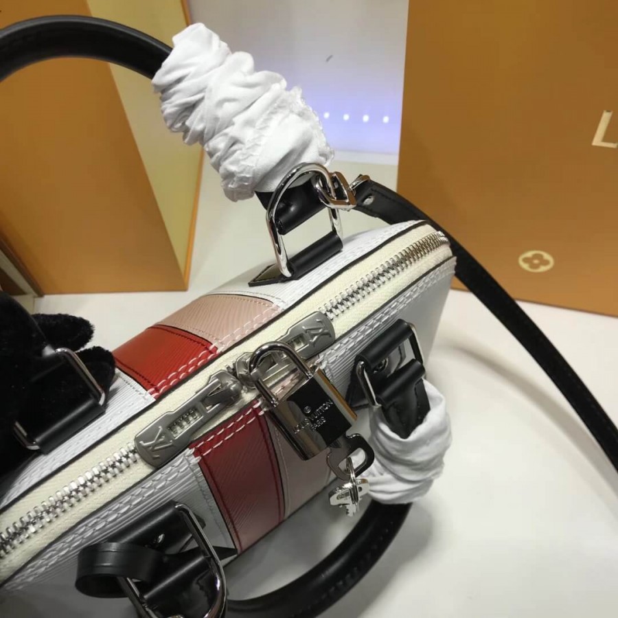 Esta bolsa Alma BB é criada de couro EPI granulado com acabamento liso de couro e duas listras atraentes. A faixa de dois tons, um tema visto nos sapatos da coleção do outono de 2018, é um aceno para a criação de troncos e a herança de personalização da casa. Ligante, mas prático, segura facilmente chaves, carteira, smartphone e batom. A pulseira removível traz versalidade ao Alma BB, que também pode ser usado por cima do ombro ou através do corpo.