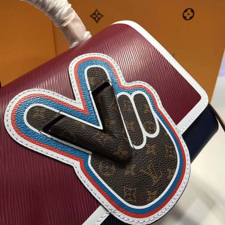 v Para Vuitton se transforma em um símbolo de paz nesta bolsa Twist MM. O motivo é criado a partir de mini-monograma, que também cobre a trava do Twist LV, para um efeito divertido e de trompe-l’oeil contra o couro EPI colorido. A alça da sacola, um aceno de volta aos dias de escola, é acentuada com um charme de LV de couro. Encontramento de couro EPI liso