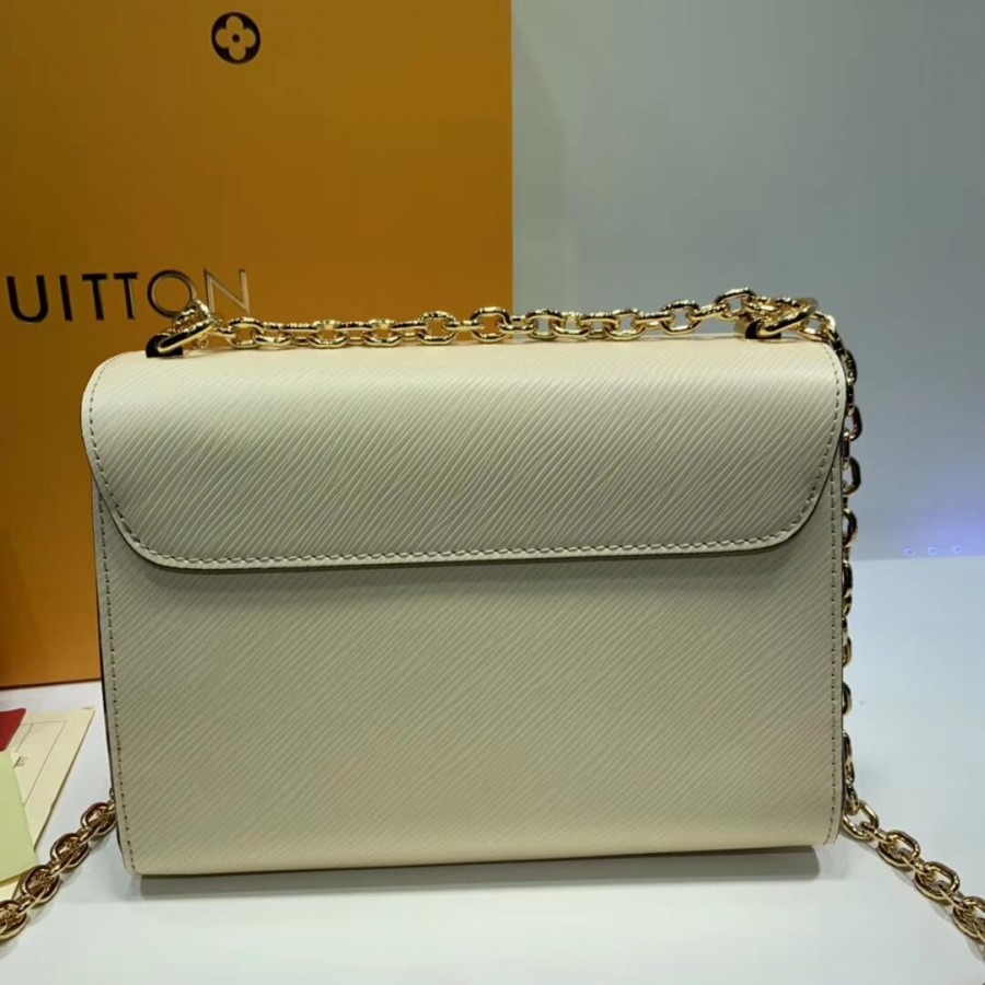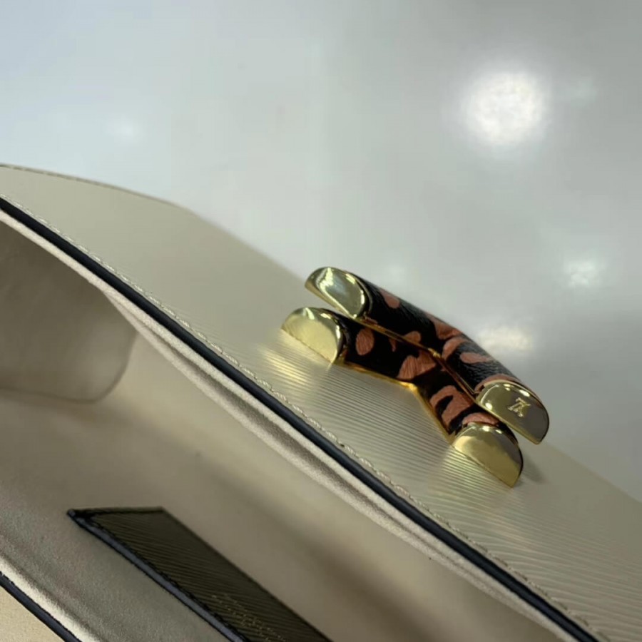 Para a coleção de acessórios e artigos de couro da LV Jungle, a icônica bolsa Twist MM recebe uma nova aparência. Combina couro EPI de quartzo com tela de estampa de leopardo. A trava de assinatura da torção com um L que se transforma em um V é revisitada de brincadeira com este motivo gráfico. Canvas