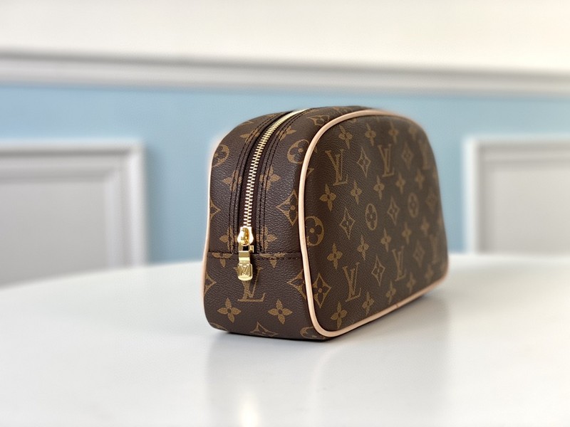 Esta bolsa de higiene pessoal prática vem em tela de monograma com enfeites de couro e possui um bolso interno e fechamento com zíper.