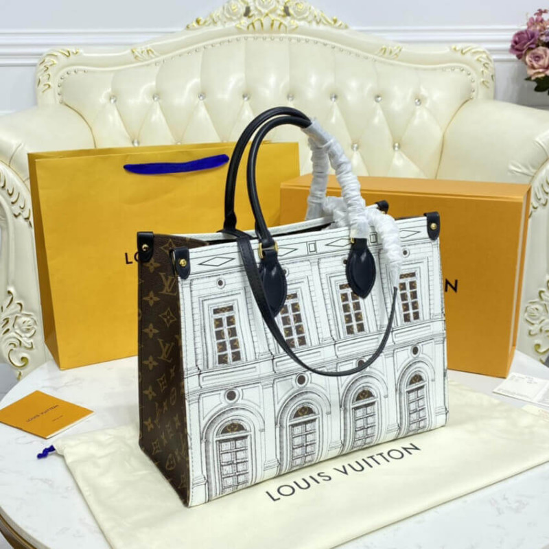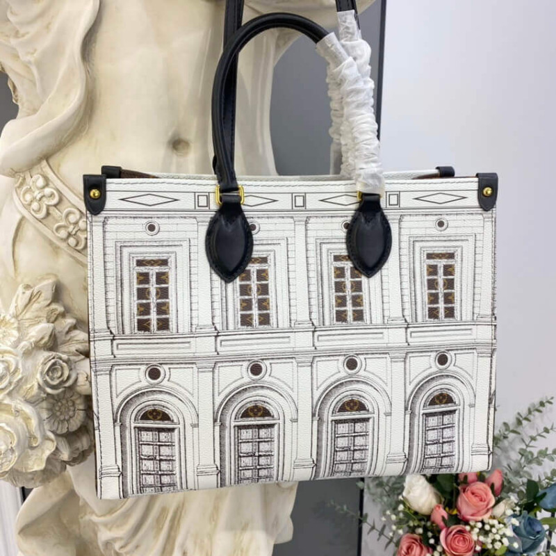 Parte da cápsula Lvxformasetti da temporada, esta impressionante tote de arquitetura Onthego MM é criada a partir de pele de bezerro fosca impressa, com acabamento em tela de monograma. A pedra de couro suave imita a pedra, sobre a qual edifícios imaginários são desenhados da maneira fornasti. Moda e função combinam-se neste carregador espaçoso, ideal para o uso de escritório ou cidade.