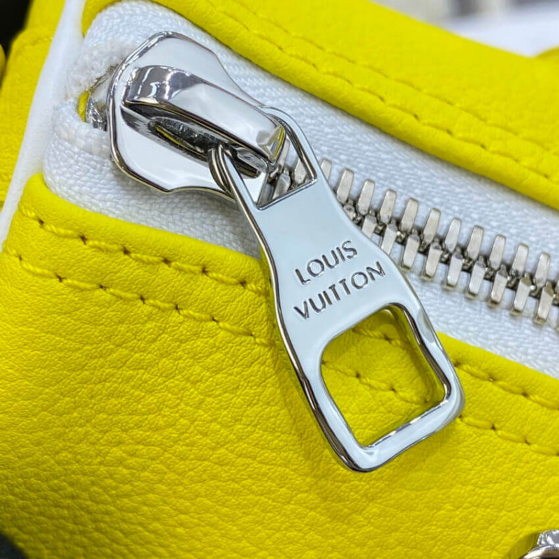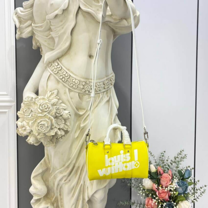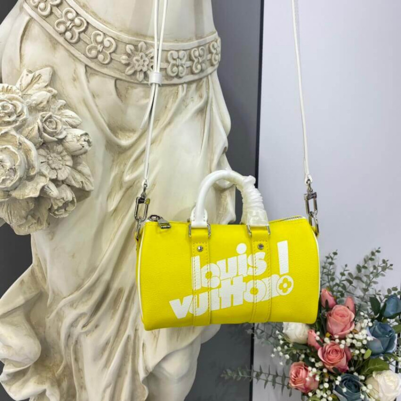A bolsa XS de Keepall para homens da moda é uma versão compacta da icônica bolsa de fim de semana do Keepall da casa da década de 1930. Aqui Virgil Abloh o cria de couro amarelo brilhante e assina com seu novo Louis Vuitton! gráfico. Possui duas alças superiores e uma alça ajustável para transportar mão ou ombro