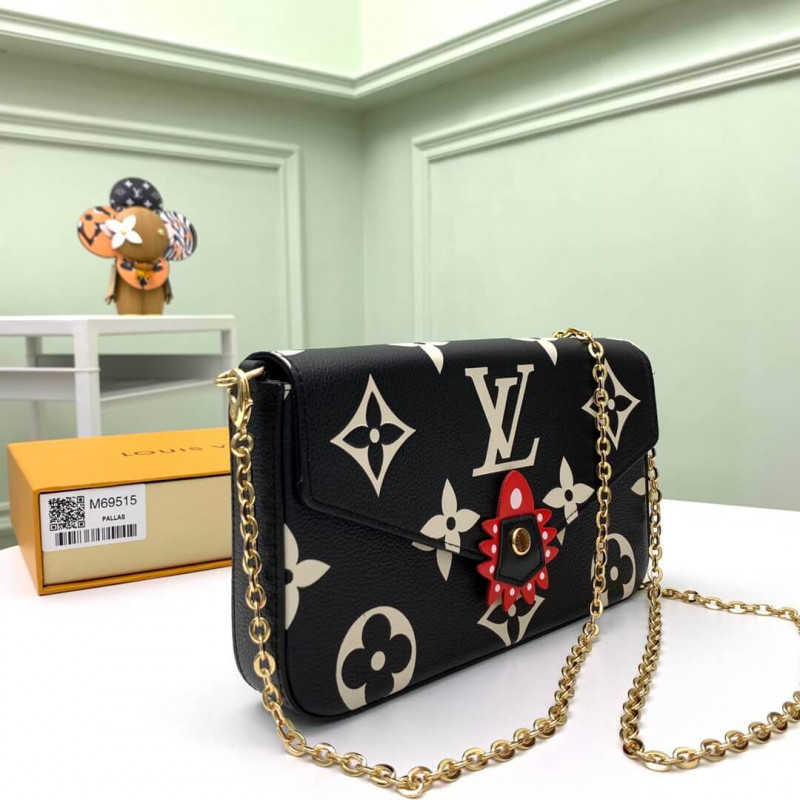 Esta edição especial do versátil Pochette Felicie faz parte da edição especial de acessórios, artigos de couro e prontos para vestir. O couro preto do monograma é impresso com o padrão gigante do monograma, criando um efeito bicolor gráfico, enquanto o fechamento do estudo da bolsa é destacado com um detalhe colorido e inspirado em artesanato. LINHO DE CAIXO DE CAIXO DE CONVERSÃO