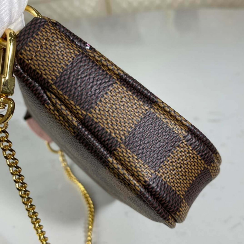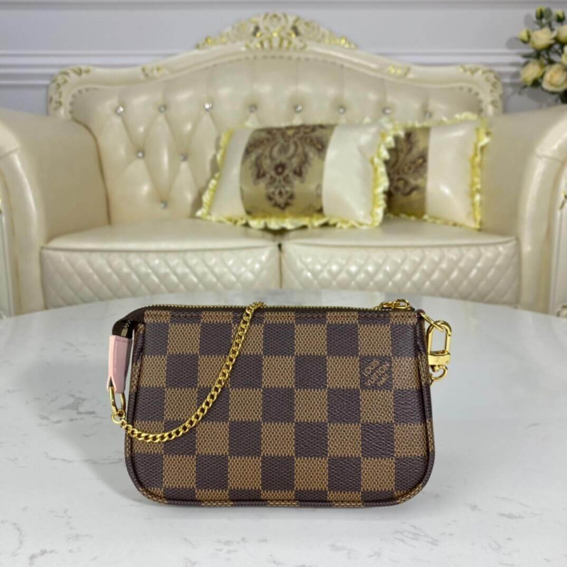 O mascote de Louis Vuitton, Vivienne, é retratado se divertindo em uma feira nesta edição de Natal de 2020 dos Mini Pochette Accessoires em Damier Ebene Canvas. As ilustrações alegres com símbolos da casa capturam o espírito da temporada. Esta bolsa pode ser anexada a um cinto ou bolsa graças à sua corrente de tons de ouro. ] Hardware de cor dourada