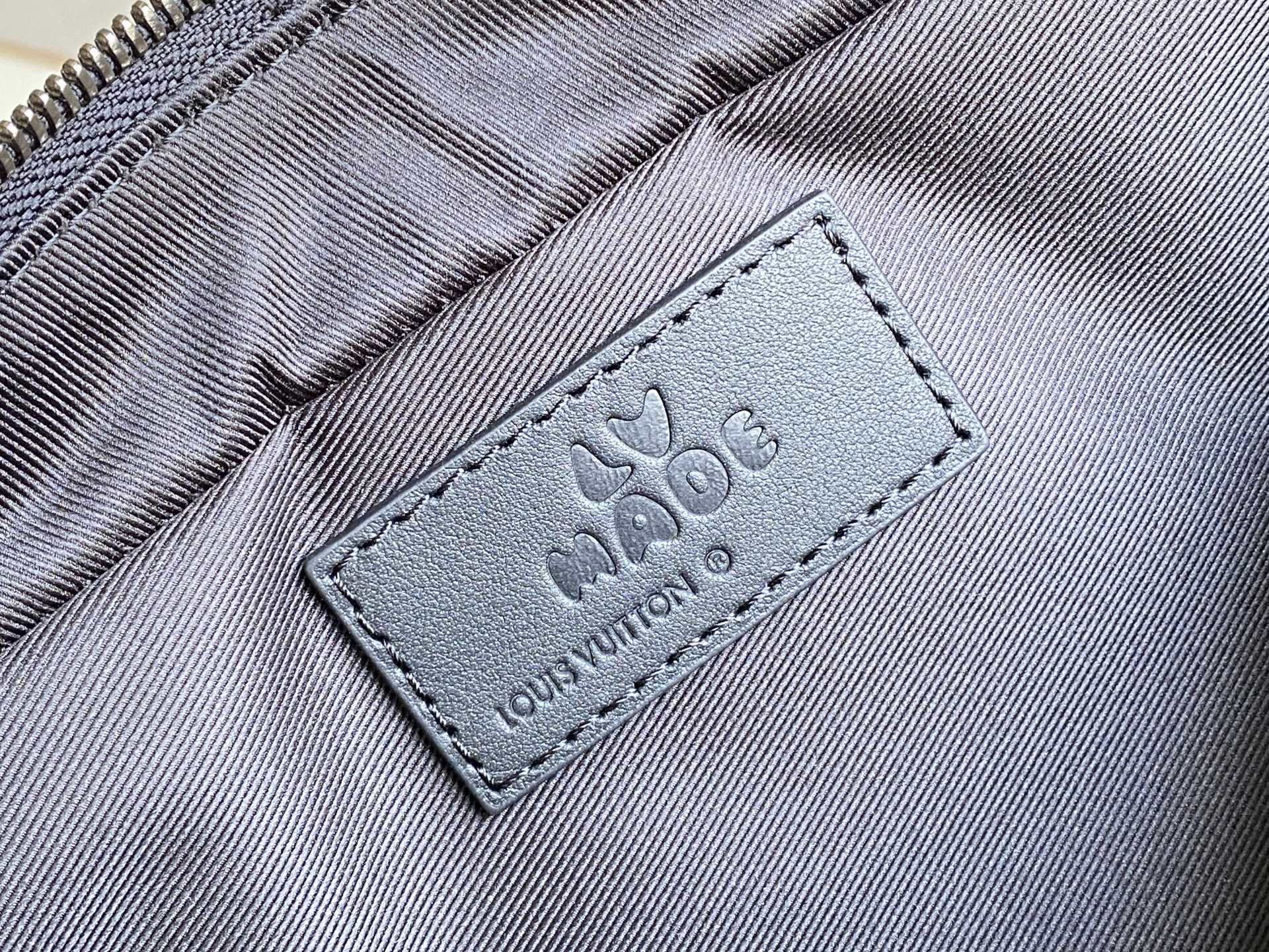 A nova bolsa de engrenagens de grandes dimensões é formada a partir de listras de monogramas eclipse, na qual o motivo do monograma aparece em listras cinza leve e escuro, como parte do nigo? X Louis Vuitton Capsule Collection. Possui um grande compartimento principal com fechamento de zíper e um bolso traseiro plano. Ele assinou com um patch do coração “Louis Vuitton fez”.
