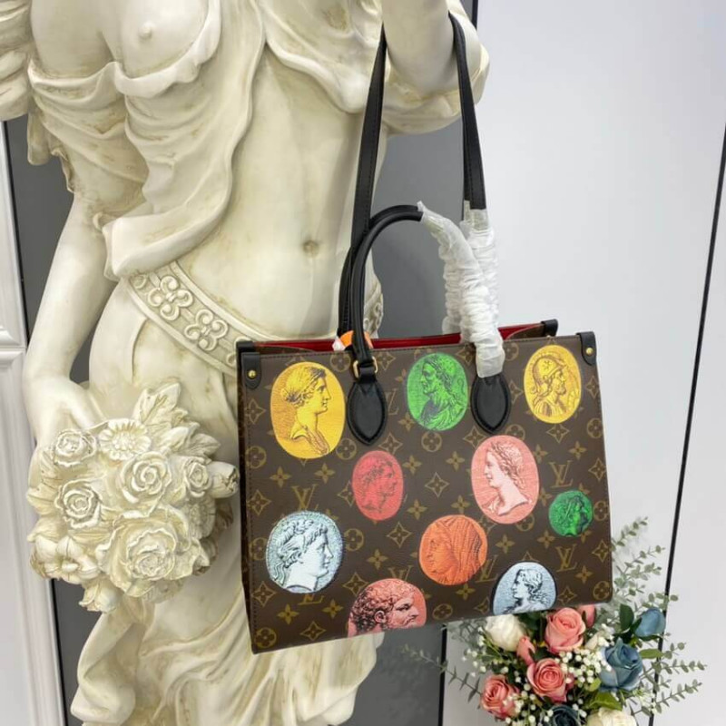 Para o outono-inverno 2021, a versátil ONhego Tote é oferecida na Cameo Canvas, uma impressão exclusiva da cápsula Lvxformasetti. As participações especiais de cores vibrantes sobrepõem o padrão icônico da casa: as imagens são baseadas em moedas antigas do arquivo Fornasetti. Elegante e prático, esse transporte é equipado com alças de Toron e alças longas, para várias opções de transporte. ]]hardware de cor dourada