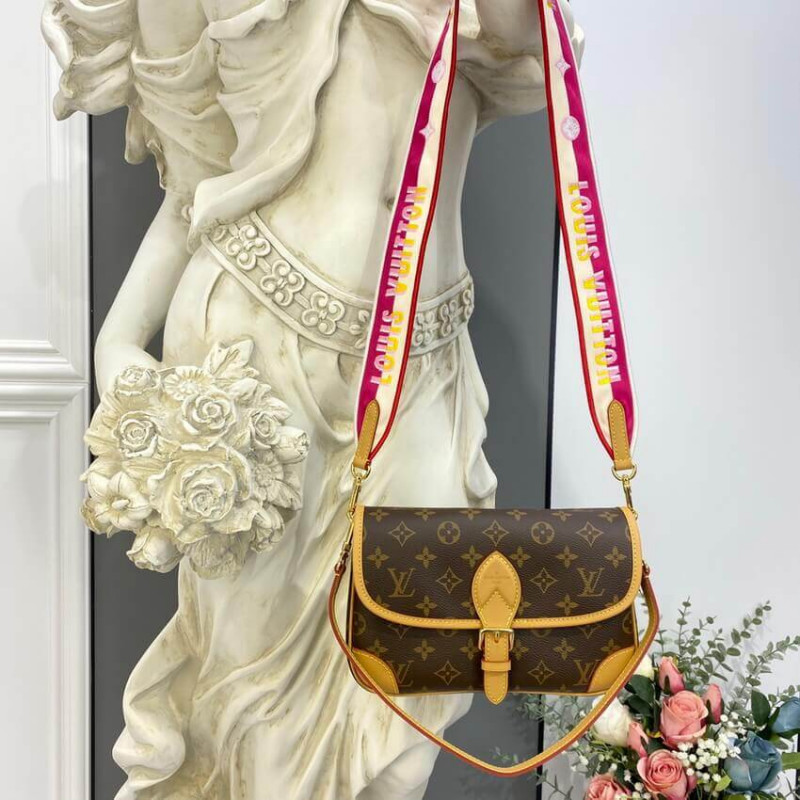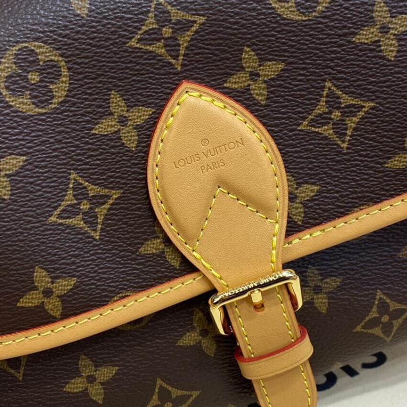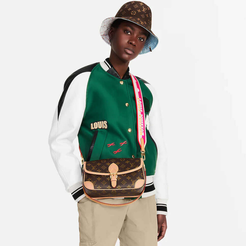 A Satchel de Diane em Monogram Canvas revisita um modelo clássico dos anos 90, combinando detalhes vintage como cantos de couro e uma fivela de inspiração de arquivo com a funcionalidade moderna de bolsos inteligentes e um interior bem organizado. A tira Jacquard larga exclusiva reverte de uma assinatura ousada da Louis Vuitton para um sutil motivo de flor do monograma. BR]]TRIMENTO NATURAL DA CHIDA DE CHIDA DE CHIDA
