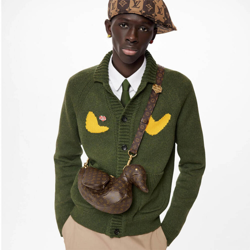 O designer japonês Nigo dá ao lendário padrão de monograma um de seus tratamentos mais imaginativos de todos os tempos com a bolsa de pato: uma bolsa de ombro compacta na forma do animal emblemático do estilista de rua. Revolta com detalhes de assinatura, como os olhos do rebite e o gancho de flor na alça removível, é um item de colecionador e uma ode à herança de Louis Vuitton. ] Hardware de cor dourada