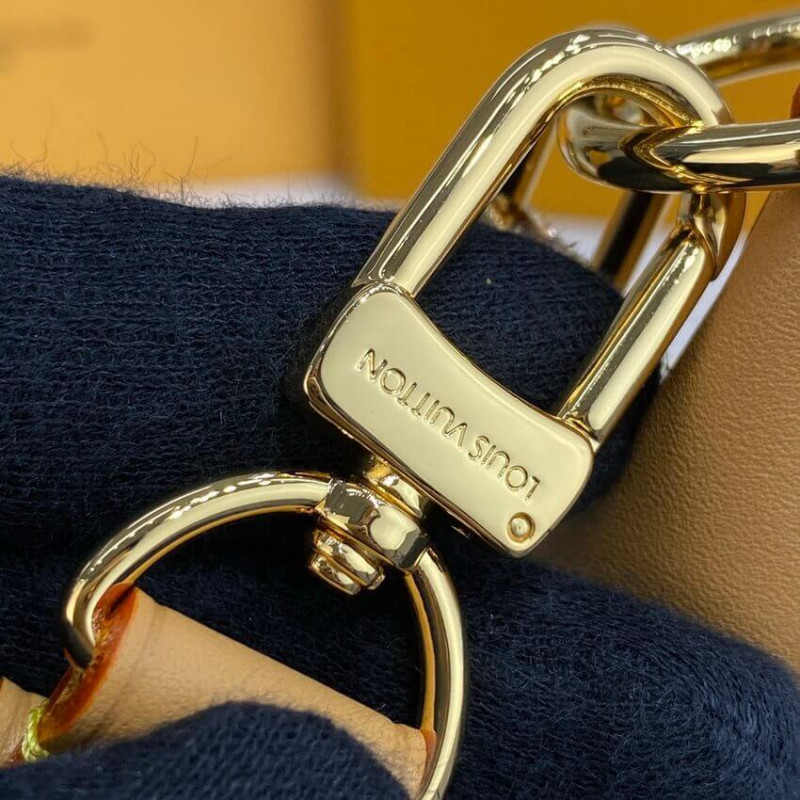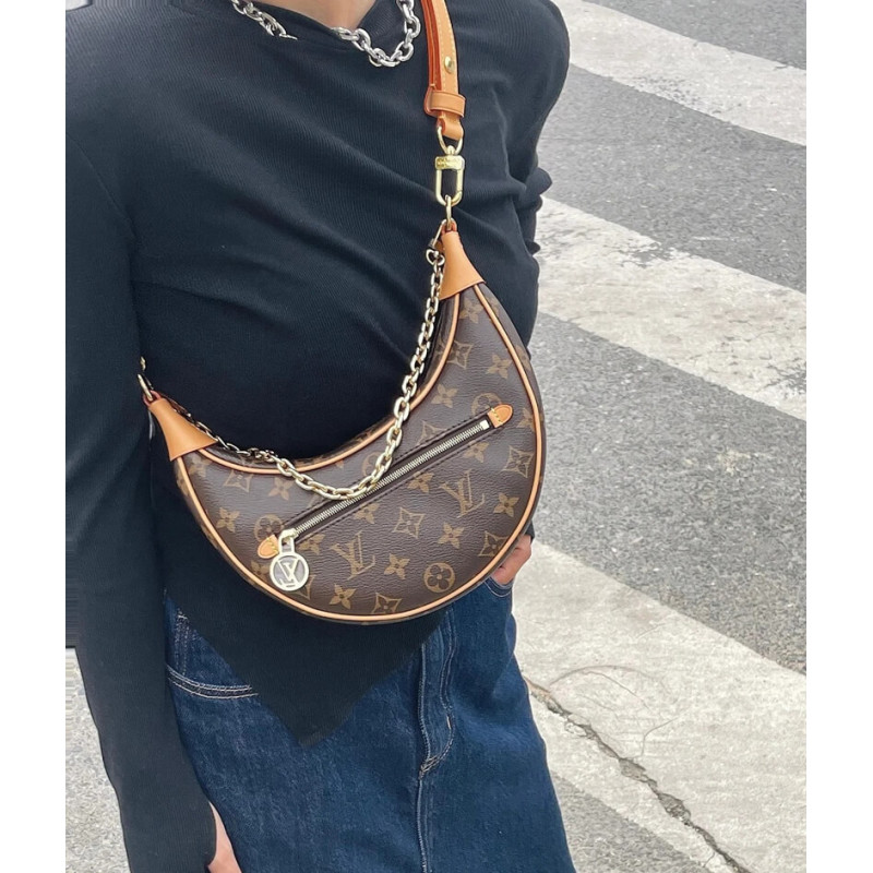Criado por Nicolas Ghesquiere para a coleção Cruise 2022, a bolsa de loop é uma baguete de meia lua, inspirada na bolsa croissant dos arquivos da casa. Possui uma forma compacta e adequada para o corpo e uma corrente para transporte de ombro, além de uma pulseira de couro de corpo cruzado. O bolso frontal fecha com uma tração do zip do círculo de LV. ] Bolso frontal com um zip de zíper do círculo de LV