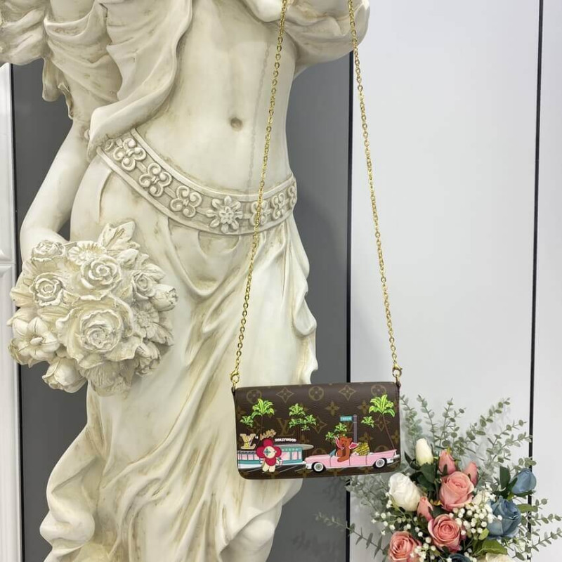 A Felicie Pochette em Monogram Canvas é decorada com uma impressão do mascote Vivienne de Louis Vuitton, em Hollywood Drive, com seu restaurante, palmeiras e famosos ursos da Califórnia em um conversível. Esta felicie sazonal também possui dois bolsos removíveis e pode ser transportada como uma embreagem ou usada no ombro ou no corpo cruzado. Canvas