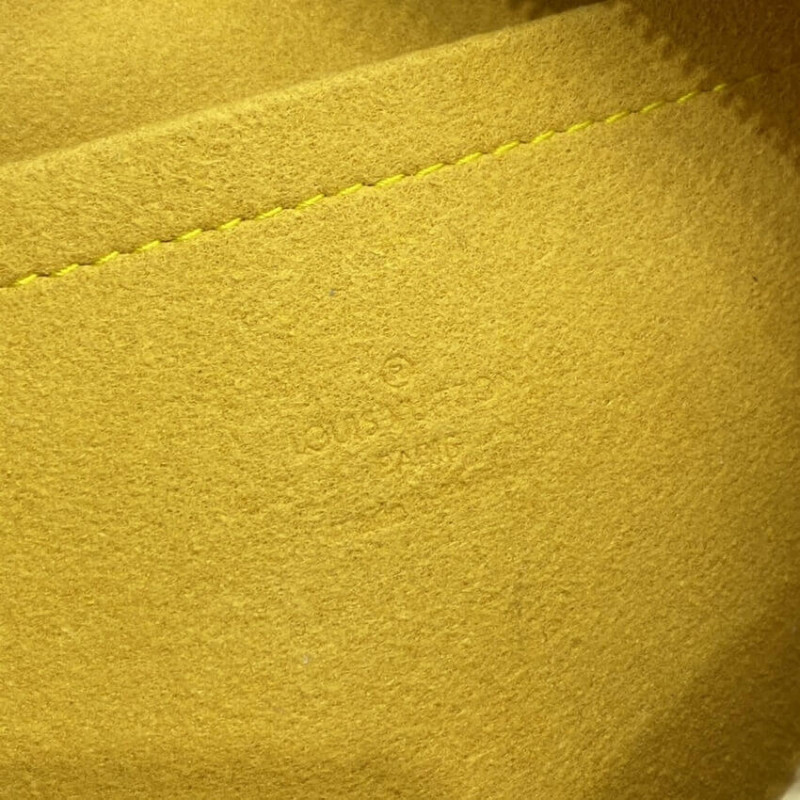 Esta bolsa projetada por Marc Jacobs para Louis Vuitton é criada de jeans azul de monograma caiado de pedra. Esta bolsa possui um bolso de aba externo com uma trava de push de latão e uma alça de cintura de jeans ajustável de monograma com um fechamento de fivela de cinto e sete entalhes. O zíper superior abre para um interior de microfibra amarela com bolsos planos e de telefone celular.